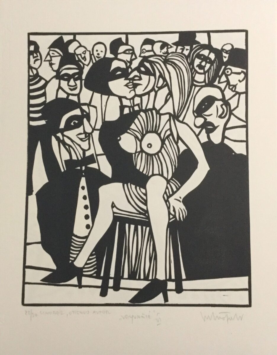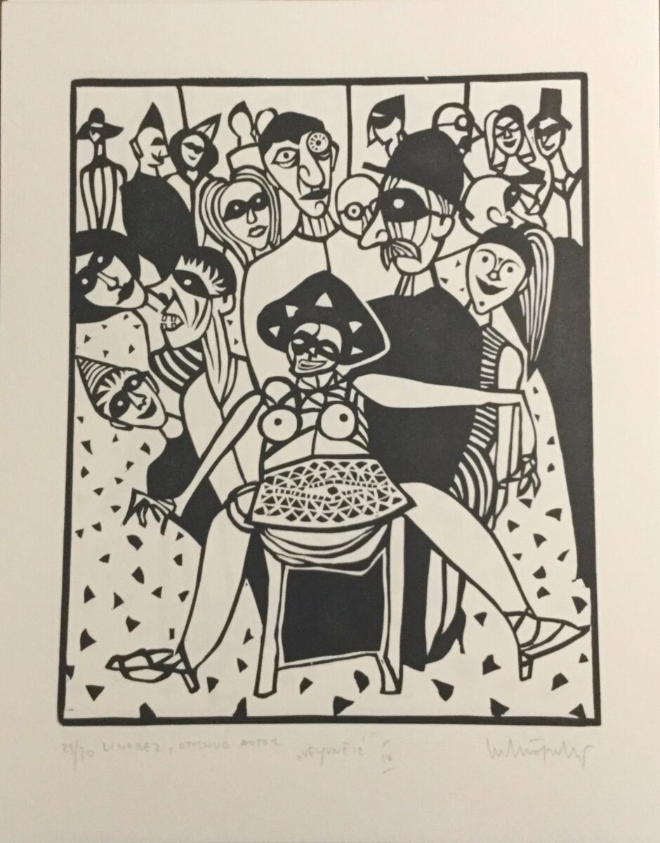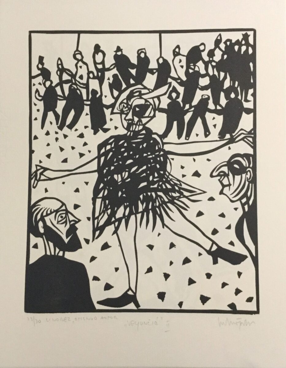 Gledajući grafičke listove, razmišljam o njima, skup rasplesanih, neobuzdanih figure skrivenih iza crnih maski, uvijek se možemo pitati, pa i kada je naš osobni život u pitanju, gdje je granica između maskiranih i otkrivenih lica i gesta, koja su prava?