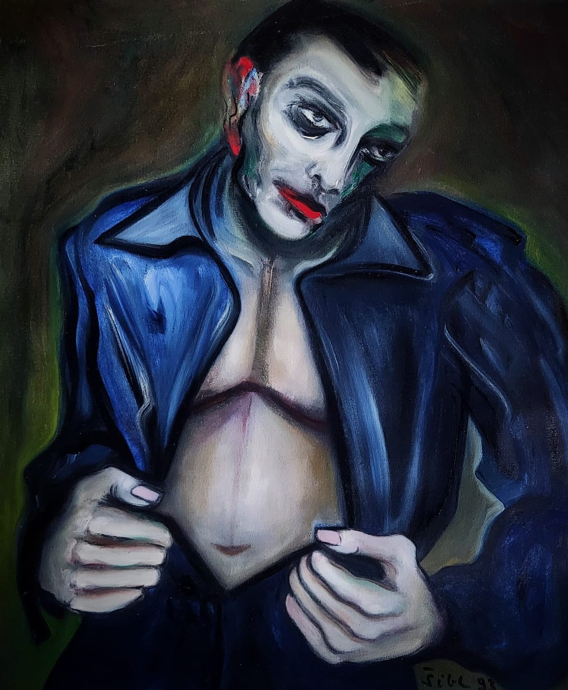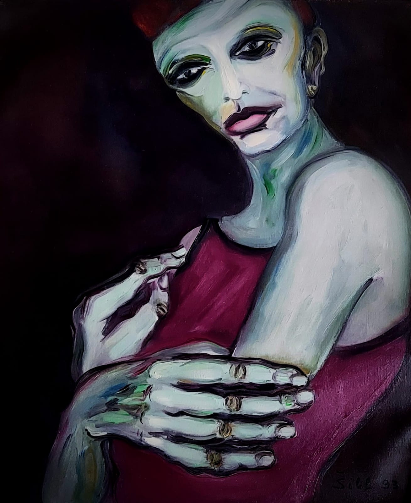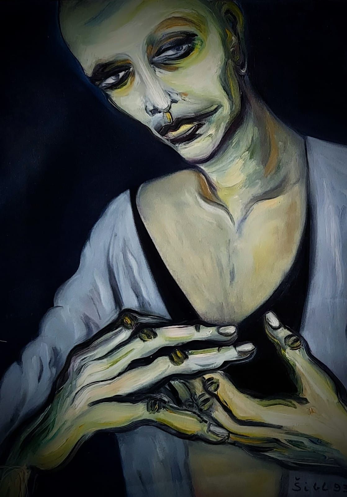 Tajanstveni likovi na Šiblovim slikama malo govore o sebi, bez mimike, grimasa, lica su im ukočena, vješto skrivajući emocije, tek ruke u prvom planu kao da su pripremne za obranu, za iznenadnu gestu dok čekaju, dok nešto ili nekoga strpljivo čekaju.