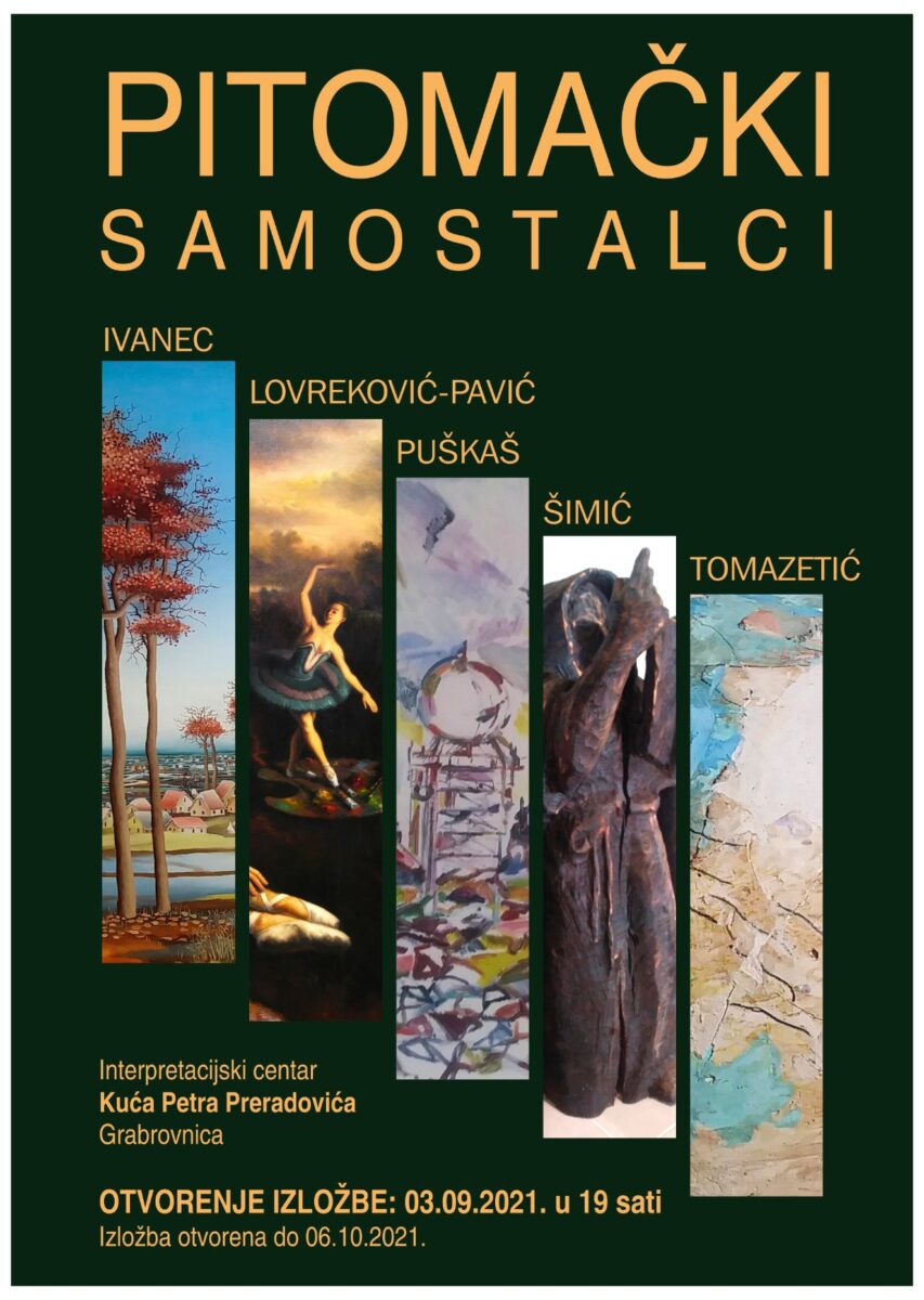 Otvorenje izložbe naziva Pitomački samostalci pet pitomačkih likovnih umjetnika održati će se u petak, 3. rujna 2021. godine s početkom u 19 sati u Interpretacijskom centru Kuća Petra Preradovića