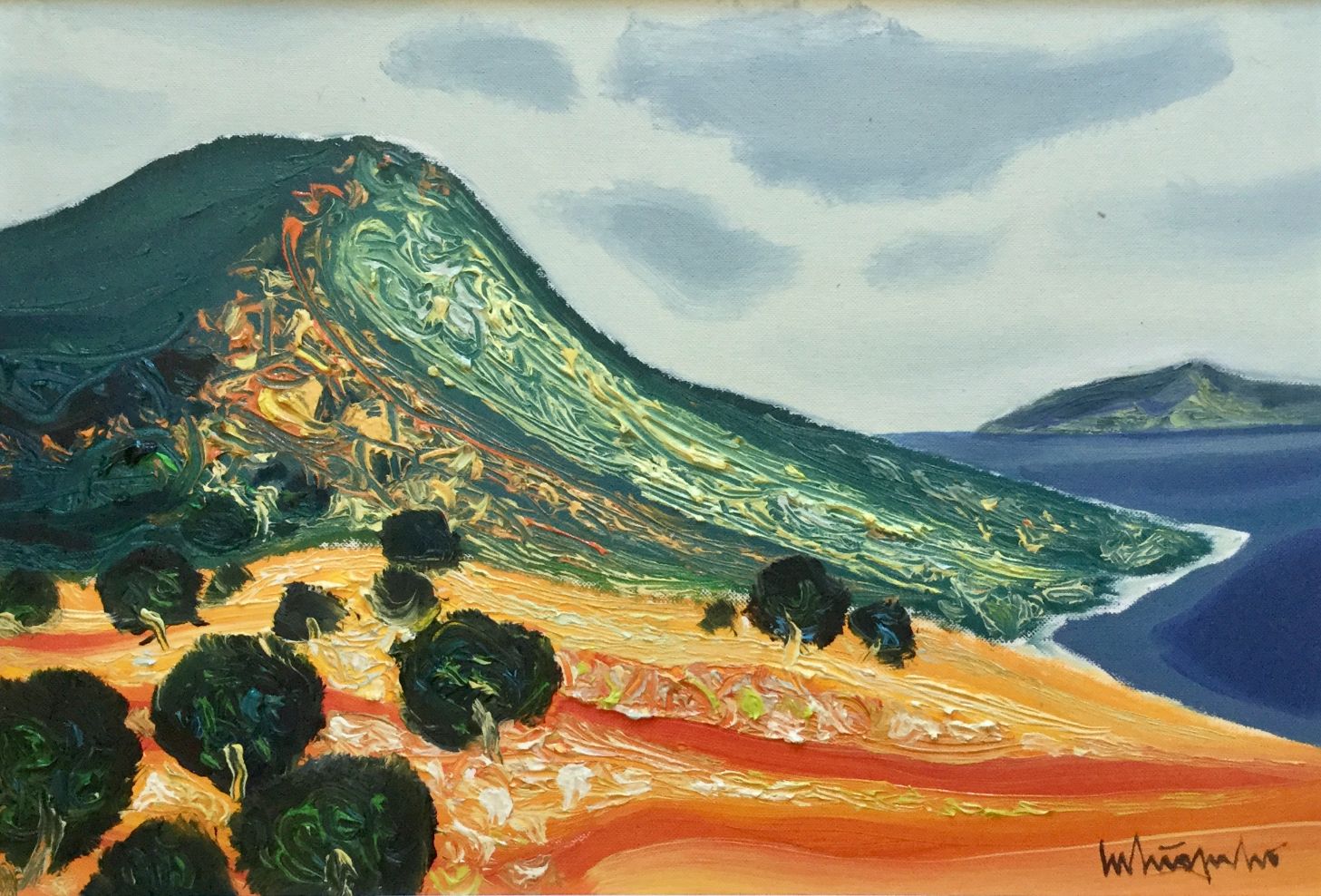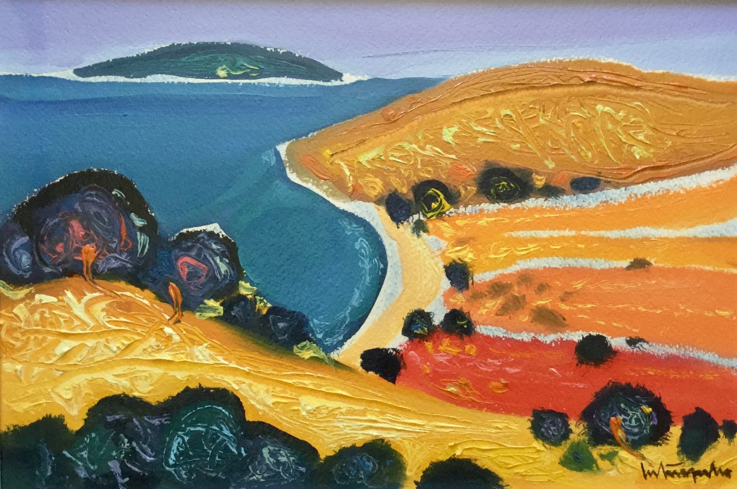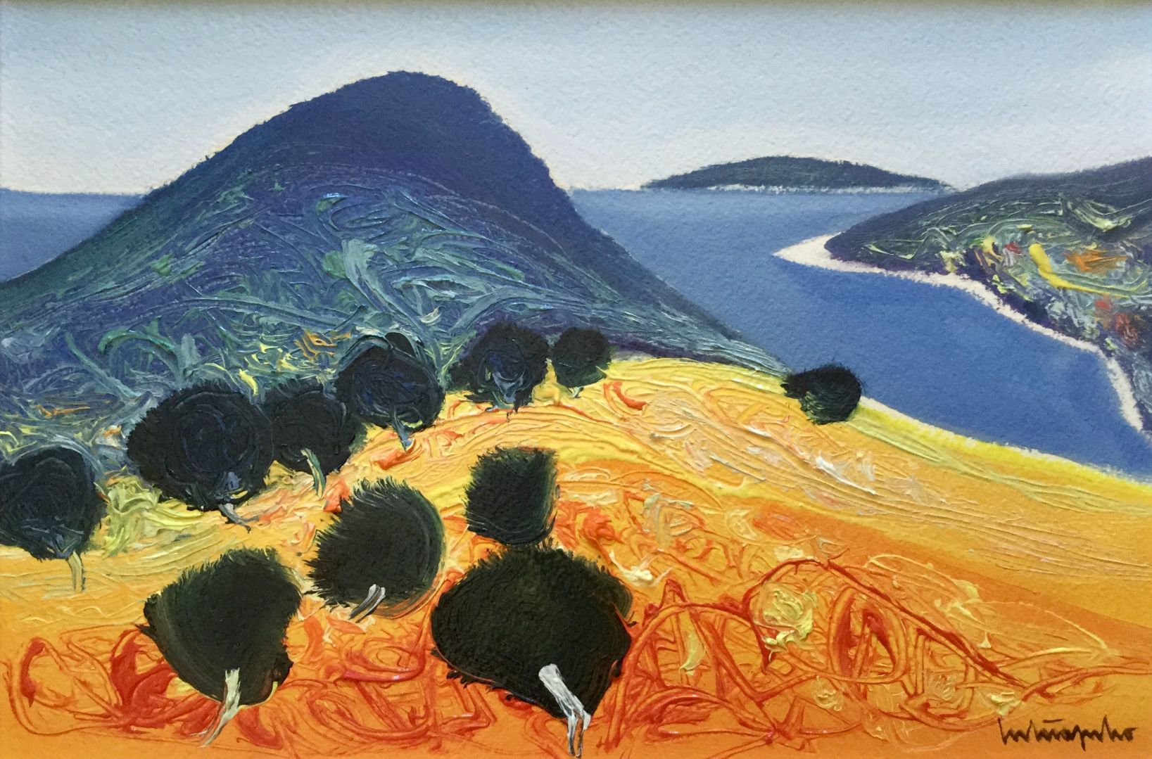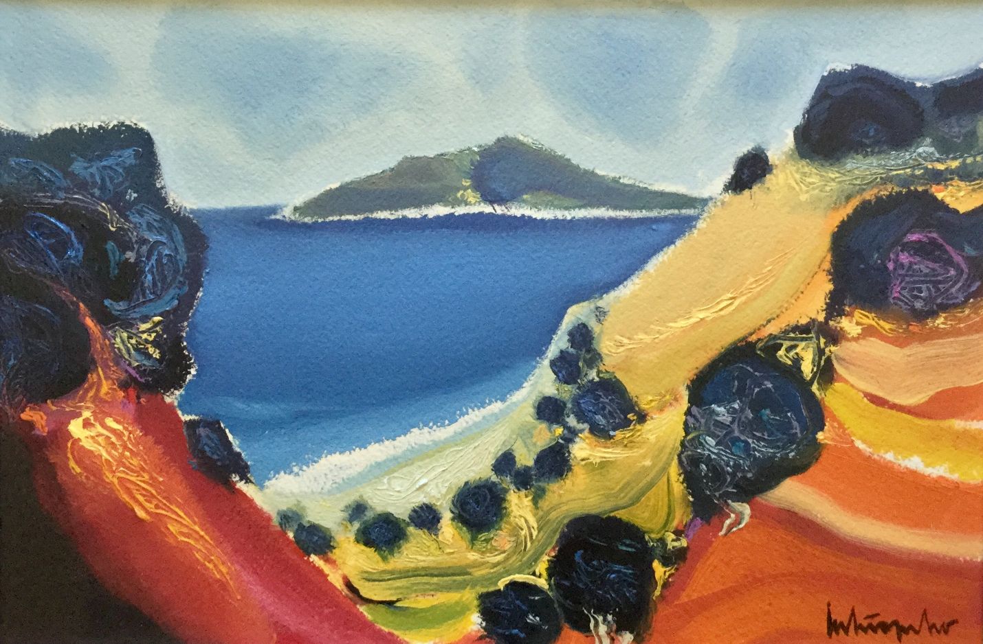 Serija impresivnih ulja na papiru s motivima pješčane obale koju nježno dodiruje more, iznad kojeg se uzdižu čudesni tajanstveni visovi, prostiru se proplanci prošarani raslinjem, dražesne tihe uvale, otoci obrubljeni zelenilo ispod oblaka i neba jedinstvene plave boje.