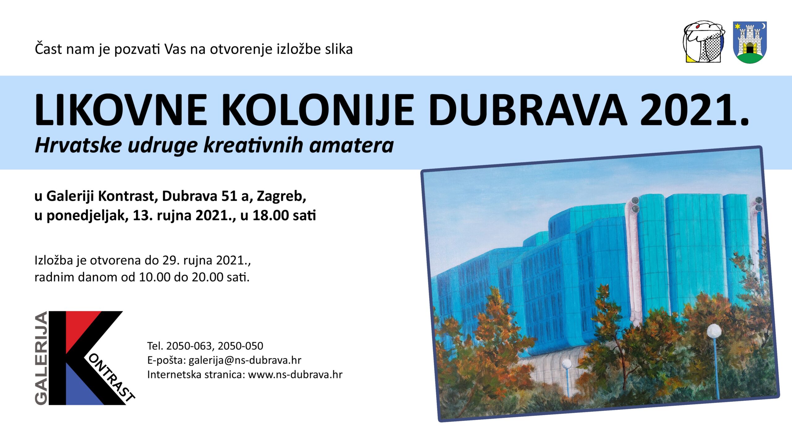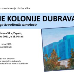 U Galeriji Kontrast, Dubrava 51 a, otvara se 13. rujna u 18.00 sati izložba „Likovna kolonija Dubrava 2021.“, u organizaciji Hrvatske udruga kreativnih amatera i Narodnog sveučilišta Dubrava