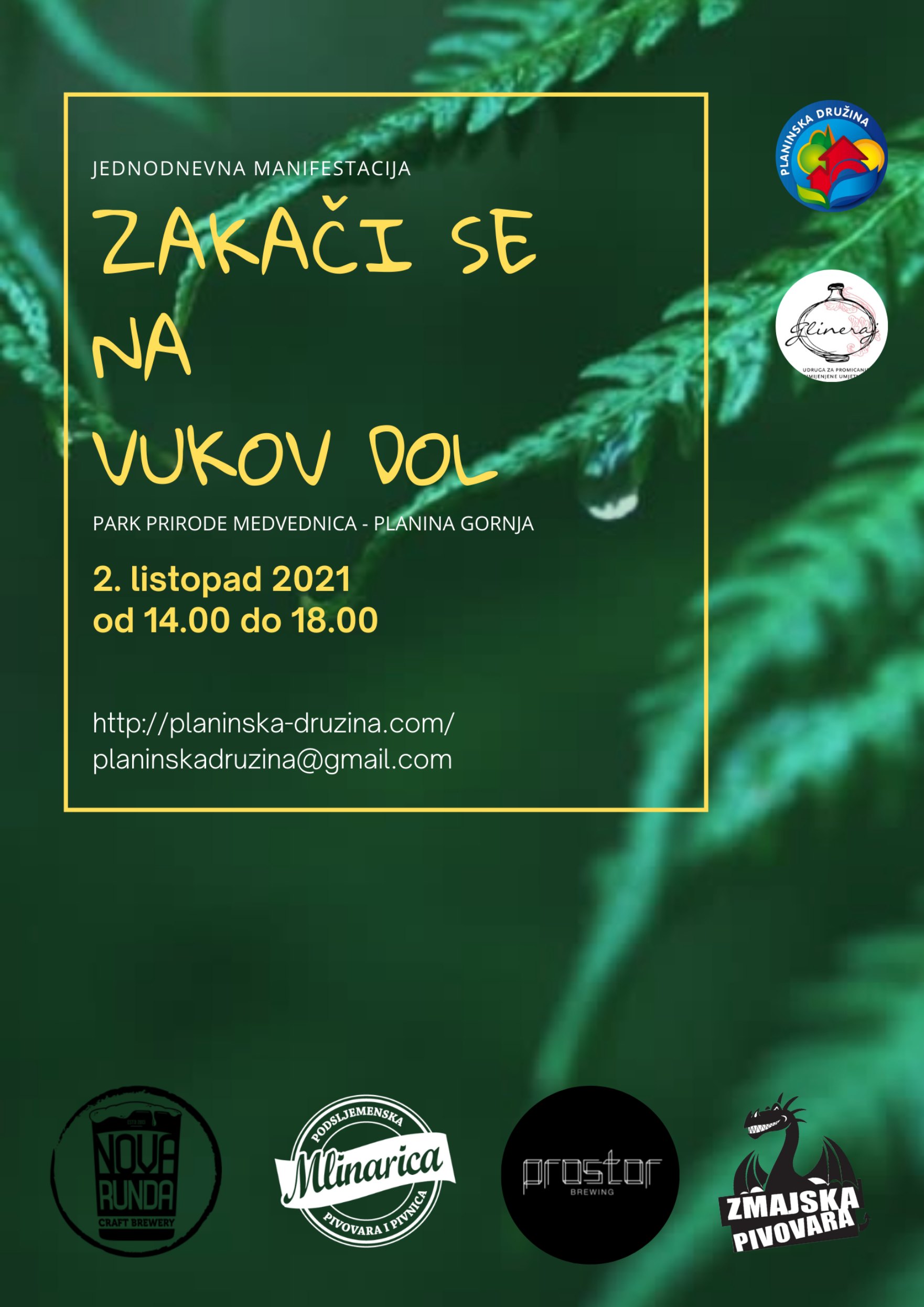 Jednodnevnu manifestacija Zakači se na Vukov dol! koju organiziramo 2. listopada s početkom u 14 sati, uz potok Vukov dol u blizini naselja Planina Gornja u istočnom dijelu Parka prirode Medvednica, povodom 10. godina postojanja udruge Planinska družina. Uz žubor potoka Vukov dol u okruženju mlinova za posjetitelje manifestacije namijenili smo, vođenu šetnju Planinski melini, igru s novim didaktičkim spravama na šumskom igralištu, koncert benda Kutna garnitura (Ishfaq Von Qafshi, Chuky i braća Trusić). Ovu manifestaciju širokogrudno podržavaju lokalne craft pivovare: Mlinarica, Nova Runda, Zmajska pivovara i Prostor brewing. U sklopu manifestacije predstavljamo outdoor instalaciju „5t ART“ (5 tona umjetnosti), koja će biti prva u nizu umjetničkih djela u sklopu „Vukov dol environmenta art galerije“. Posjetiteljima ćemo omogućiti sudjelovanje u kreiranju instalacije 5t ART na način da će velike željezne znakove sami puniti s doniranom keramikom. „Glineraj – udruga za promicanje primijenjene umjetnosti“ održat će kreativnu radionicu za djecu i odrasle pod nazivom „Dodir gline“ na kojoj će sudionici naučiti neolitički način izrade primjenjive keramike.