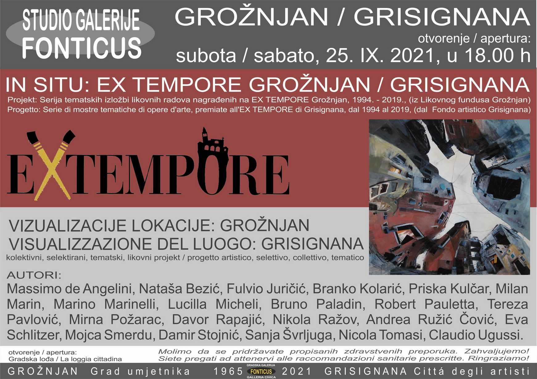 Questa mostra, all’interno del progetto “IN SITU: EX TEMPORE GROŽNJAN / GRISIGNANA”, presenta una selezione di opere sul tema del luogo, la città in cui si svolge questo evento già da molti anni. Va sempre detto che Grisignana è la Città degli artisti dal 1965. Dall’allora colonia dell’arte, dall’arrivo degli artisti in questa città quasi abbandonata su una collina, sopra il fiume Quieto, è nata una città in cui gli artisti vivono e lavorano. Successivamente vengono affiancati da eventi musicali, teatrali e altri. In quegli anni a Grisignana sono cambiate tante cose. Oltre agli studi e gli atelier, la Galleria cittadina Fonticus, lo spazio rappresentativo della città, riproduce continuamente la produzione artistica recente. La manifestazione dell’Ex Tempore di Grisignana, che rinnova fortemente l’idea della Città degli Artisti, viene organizzata nel 1994 dall’Unione Italiana, dall’Università Popolare di Trieste, dal Comune di Grisignana e dalla Comunità degli Italiani di Grisignana. In questo modo, la Fondo Artistico Grisignana si stava allargando con alcune opere premiate e, naturalmente, grazie anche alla gentilezza degli artisti e all’ attività della Galleria Fonticus e del Comune di Grisignana. Una parte delle opere del FAG sono state realizzate durante le Colonie d’arte di Grisignana, nel 2007, 2008 e 2009. Nel 2020, questa collezione contava 889 opere di 343 autori provenienti da 19 paesi.