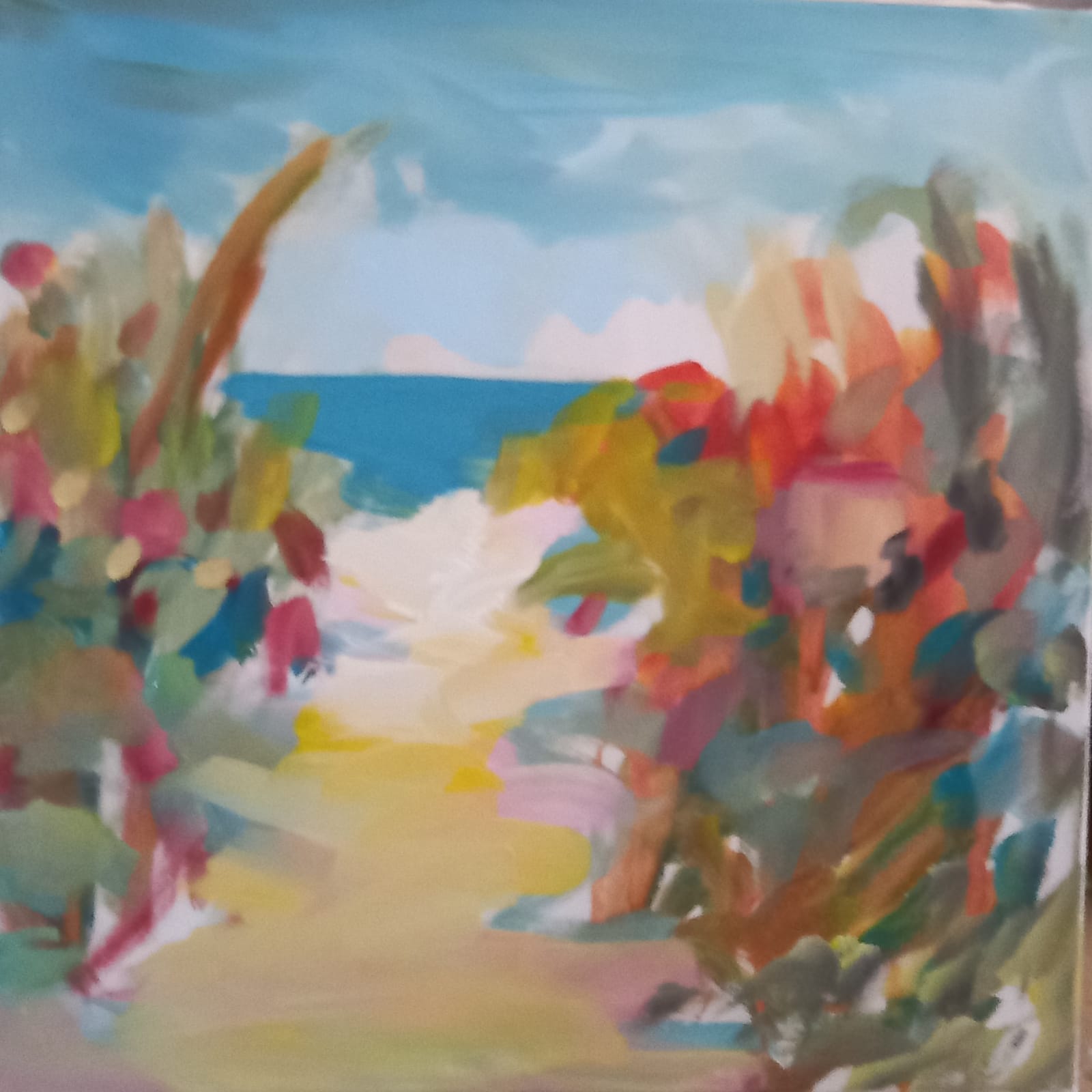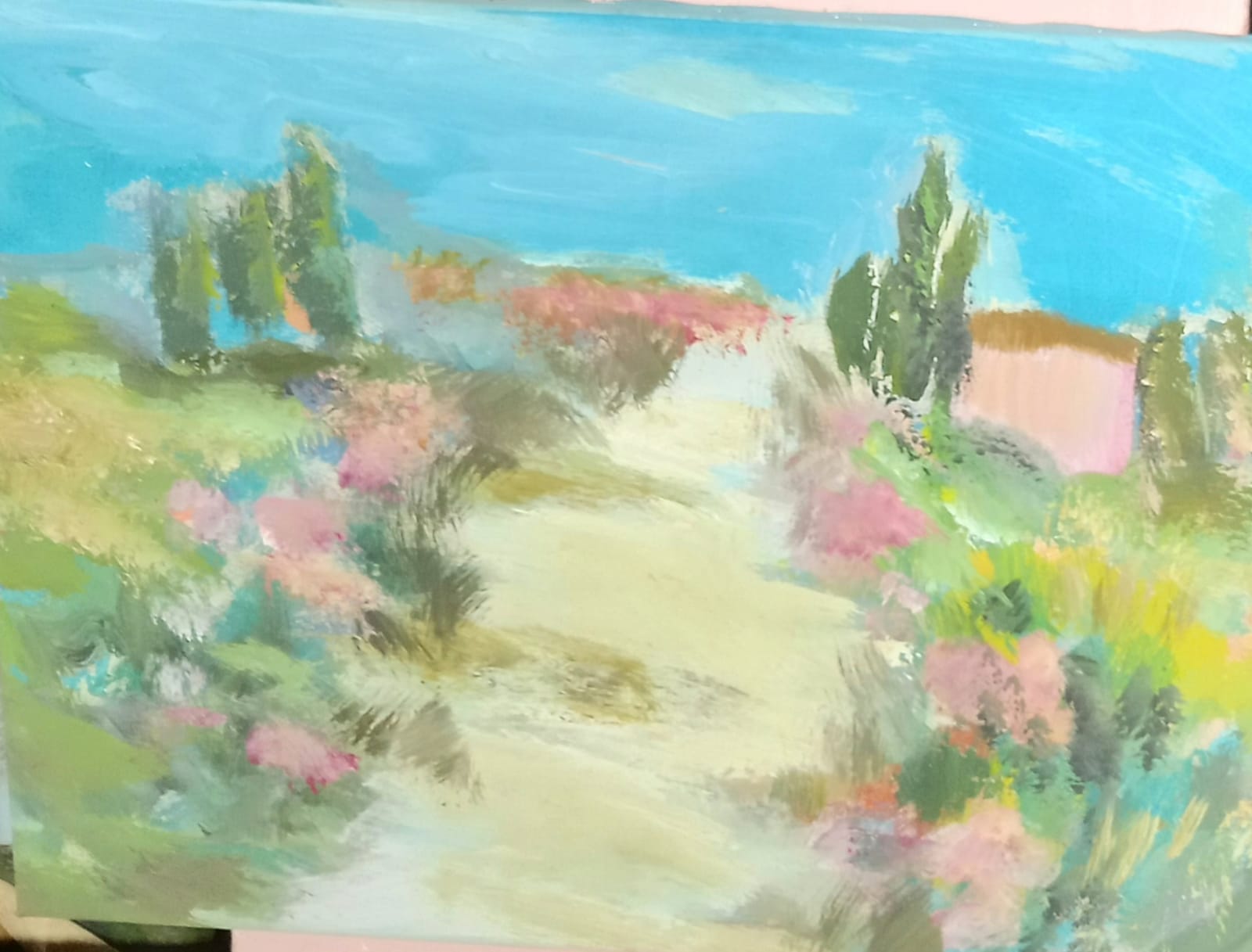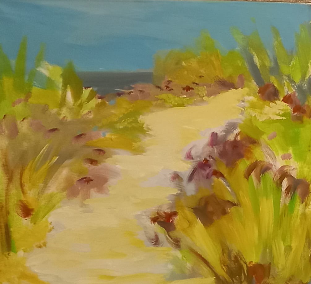 Motiv stazice uz raslinje ili put uz more je čest na ovoj izložbi koji je odraz nekih uspomena iz mog djetinjstva i slike prirode koju sam često promatrala živeći i boraveći kod bake koja je imala kuću uz more i pružila mi prekrasno djetinjstvo. Mogu reći da je to bila privilegija… kao i svima nama na Mediteranu gdje smo okruženi motivima koji nas puštaju dosegnuti neke ljepote osvajajući našu podsvjest i dajući mašti prostora.