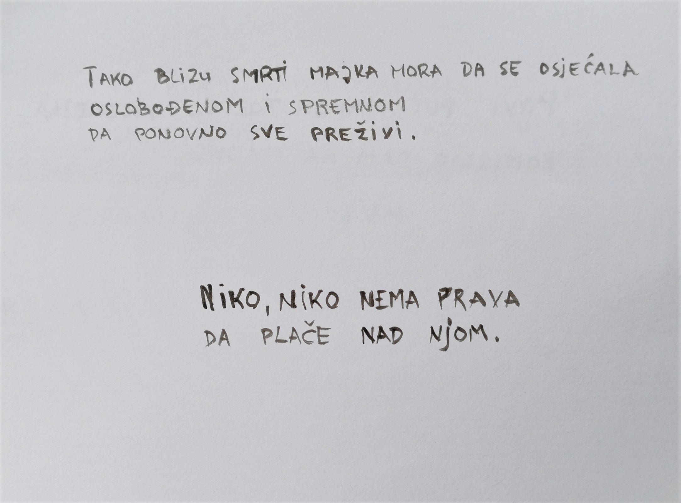 Ovaj likovni projekt izaziva indignaciju. Umjetnikova interpretacija memorijskih i realnih stanja/situacija ove radove svrstava u svjedočenja vremena. Njegovi radovi zasigurno neće izaći objavljeni u modnom časopisu, ali galerijski prostor to omogućuje. Osvješćivanje je ponuđeno na artistički način. To je učinjeno ponekad jasno narativno, ponekad prikriveno, ali uvijek snažno. Umjetnik znalački, ali i doživljajno interpretira svijet koji ga okružuje. Pritom, prezentacijom u obliku izložbe upozorava na stanje i indirektno inicira reakciju: pobunu ili daljnju pasivnost nas, usamljenih jedinki dotrajalog svijeta.