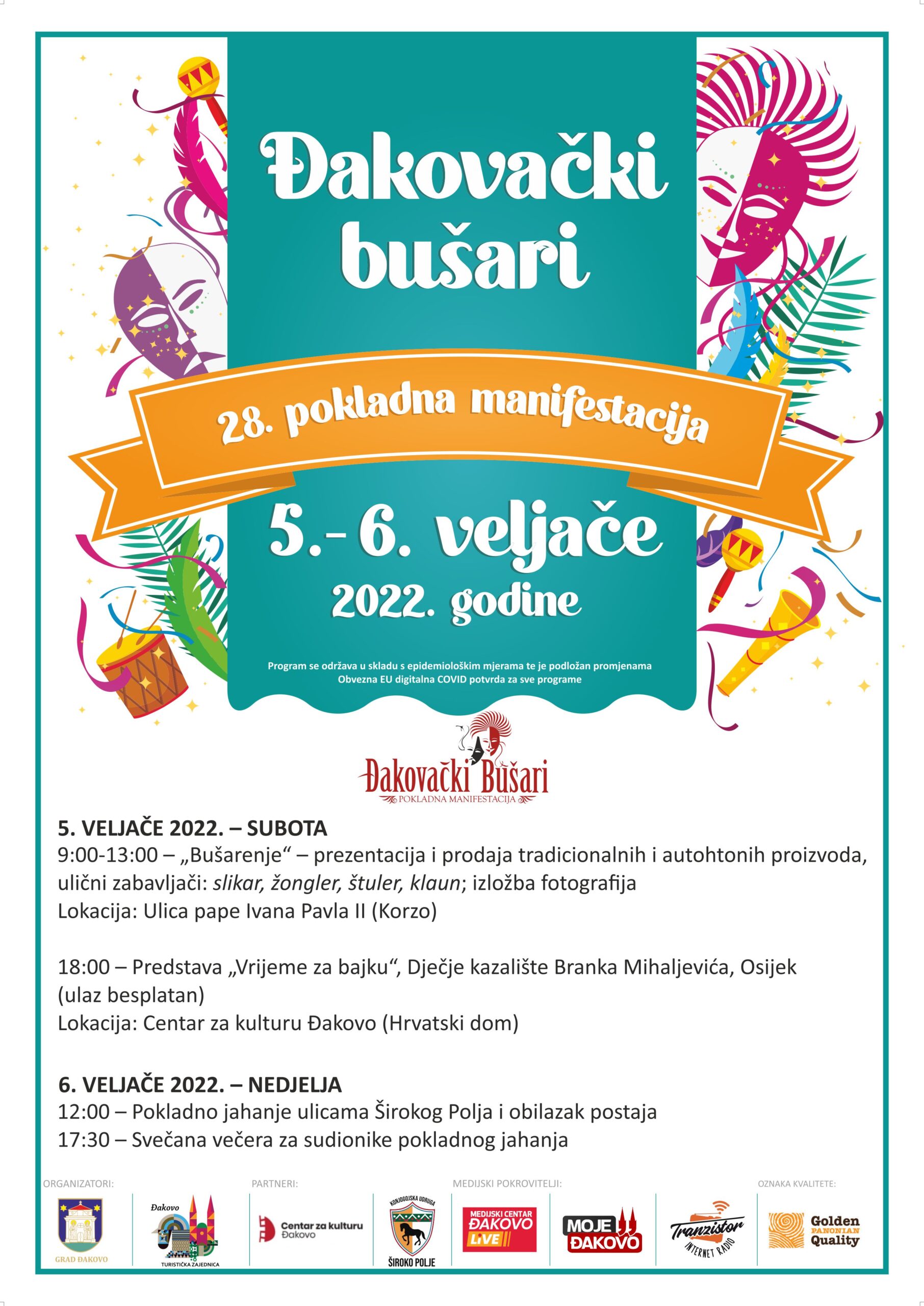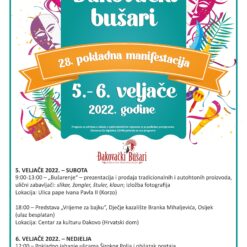 Pokladna manifestacija 28. Đakovački bušari održat će se 5. i 6. veljače 2022. u online/ offline kombinaciji. Organizatori 28. „Đakovačkih bušara“ su Grad Đakovo i Turistička zajednica grada Đakova, uz partnerstvo Centra za kulturu Đakovo i Konjogojske udruge Široko Polje.