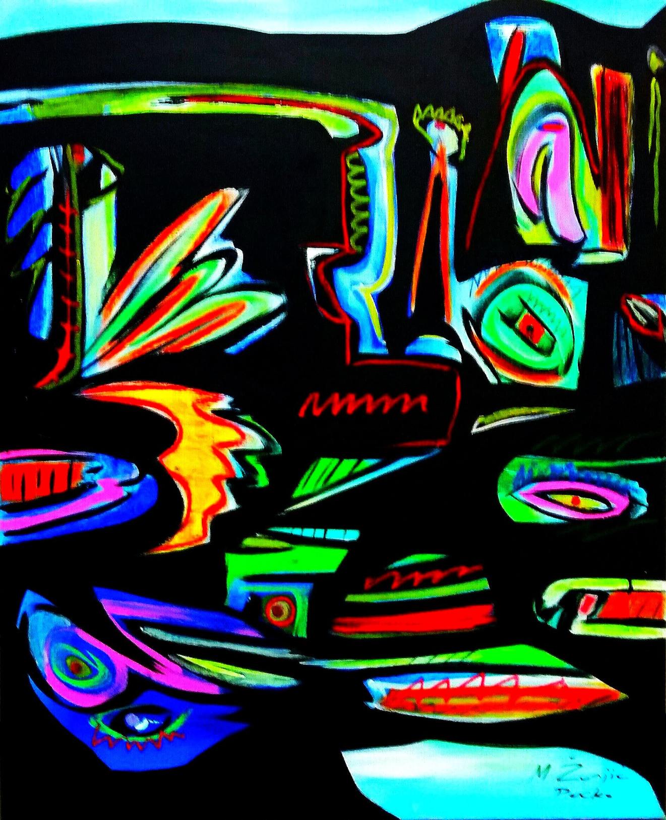 U novoj seriji akrilika na platnu, 100 x 100 cm, suvremeni hrvatski likovni umjetnik, slikar iznimne energije i radoznalosti, slikar Mladen Žunjić, kontinuirao kreira brojne cikluse manje po broju slika ali značajne po svom artističkom dometu, posebice kada je u pitanju koloristička izražajnost