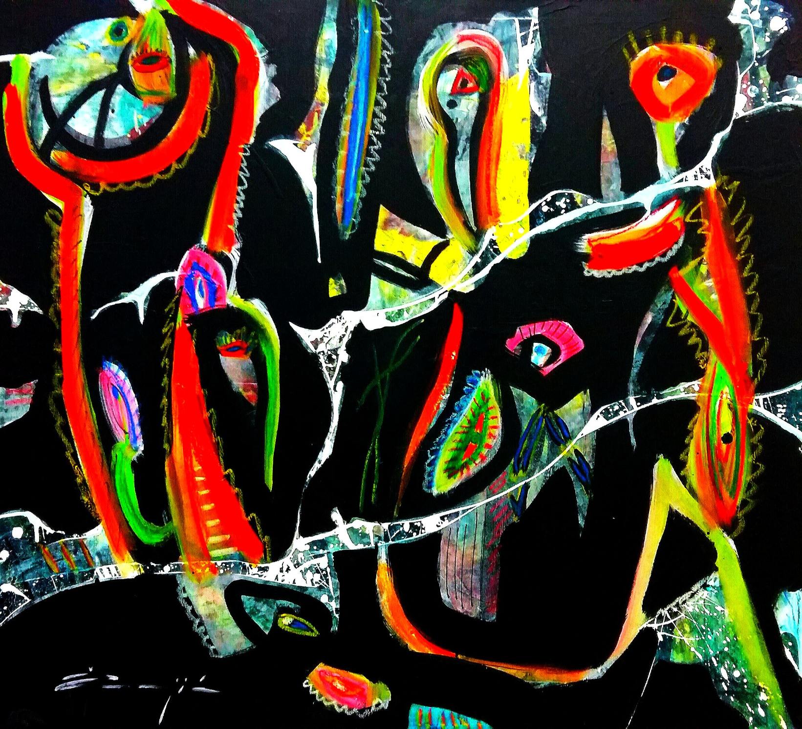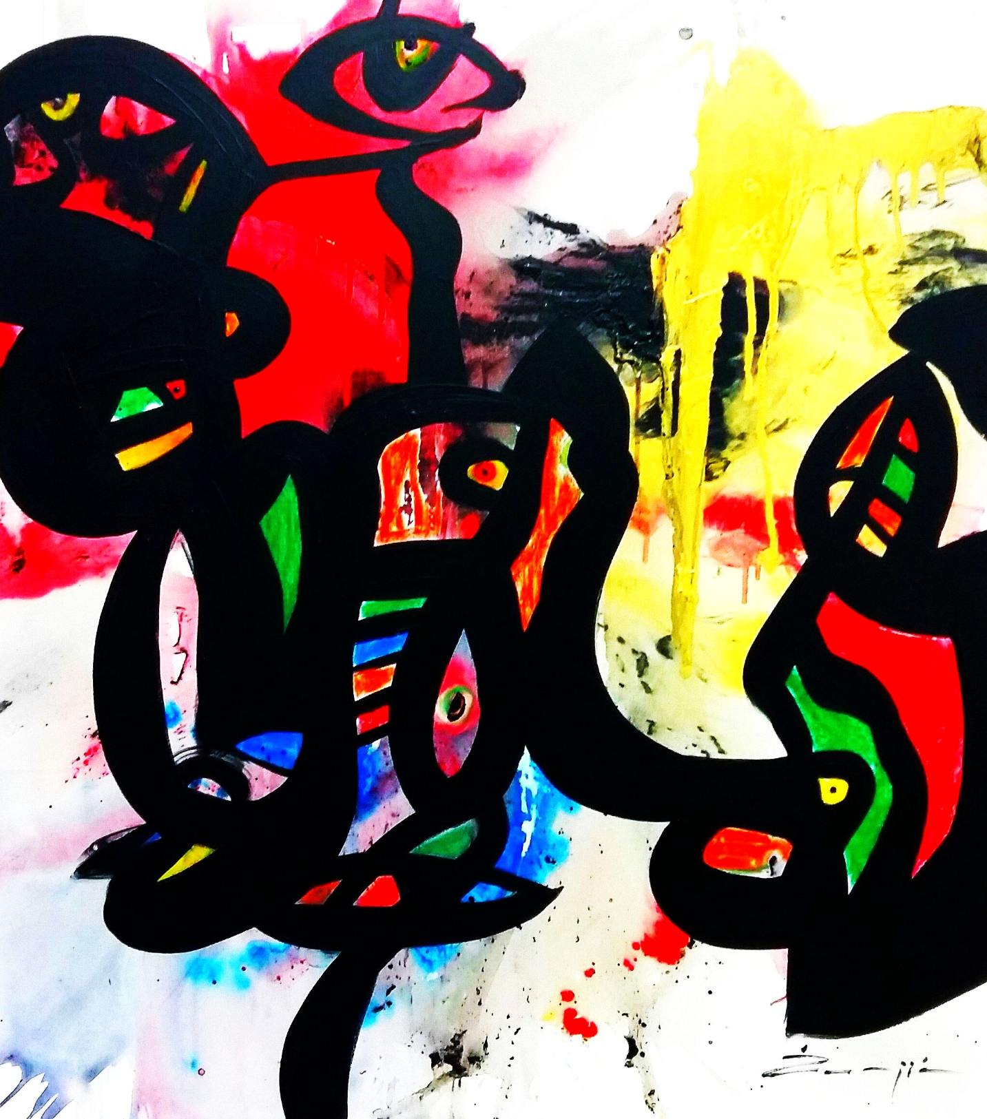 Te zamršene, zapletene linije, za koje ne znamo, skrivaju li ili pak odaju, u isti se trenutak pitajući što promatraju širom otvorene oči pažljivo raspoređene po cijeloj površini slike, najavljuju li one, novo, neizbježno?