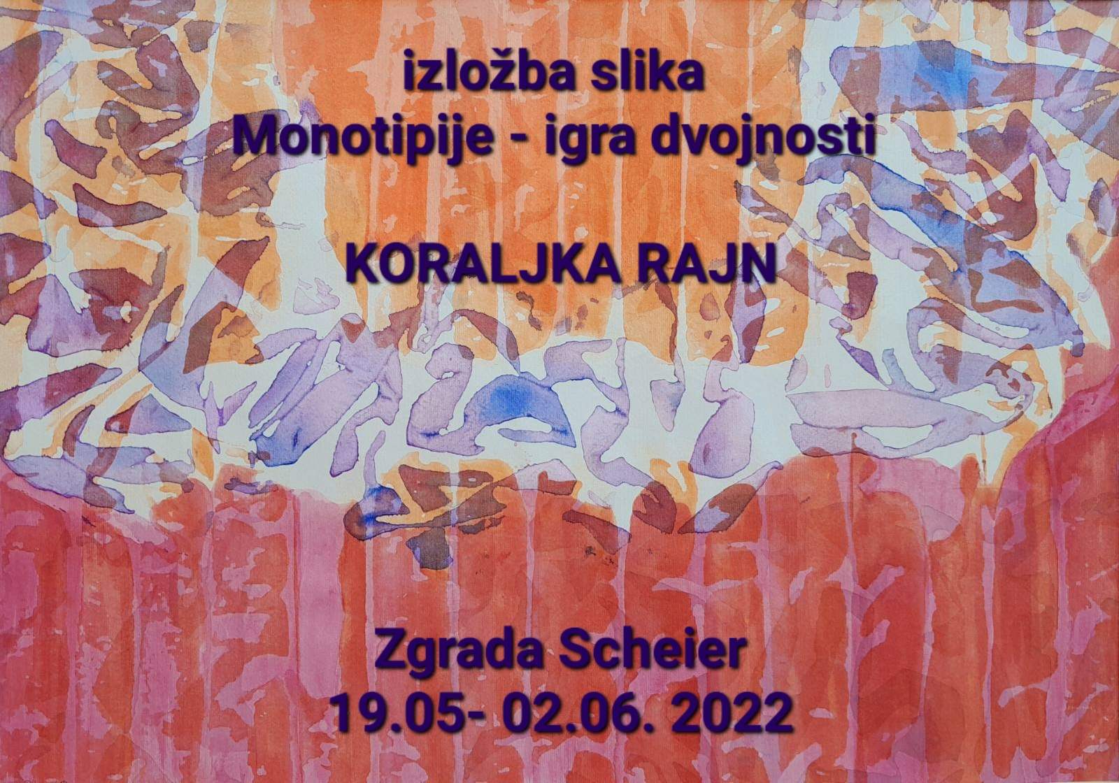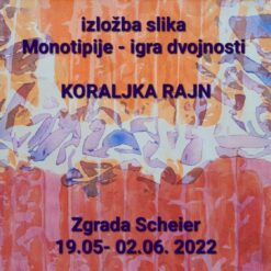 Varaždinska slikarica Koraljka Rajn otvorila je 19. svibnja u čakovečkoj palači Scheier 18. samostalnu izložbu slika pod nazivom MONOTIPIJE – IGRA DVOJNOSTI. Međimurskoj likovnoj publici predstavila se s 23 monotipije, zapravo otisaka svile na papiru, nastalih u razdoblju od 2012. pa do 2022.godine. O radu umjetnice i izloženim djelima govorila je autorica predgovora u katalogu Dalia Oluić, dok se za umjetnički dio programa pobrinula poznata varaždinska pjesnikinja Ljubica Ribić. Također, prisutnima se prigodnim riječima obratio i izložbu proglasio otvorenom organizator izložbe i predsjednik Likovnog udruženja Čakovec, Toni Fažon. Izložba će se moći razgledati do 2. lipnja 2022. godine.