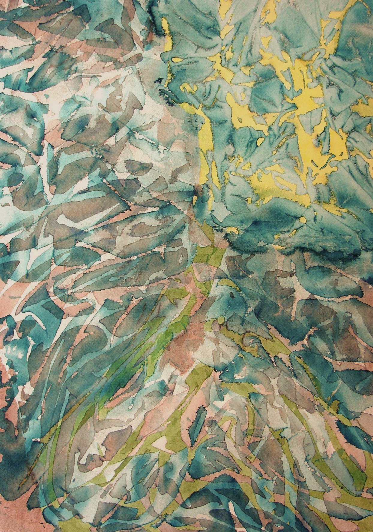 Zanimljivo da je Koraljka Rajn prvobitno bila dio te tradicije oslikavajući svilene marame bojom za tekstil, da bi ipak naglo iz nje istupila – u šarama otisnutima na najlonskoj presvlaci na radnom stolu prepoznala je nešto više od potrošnog pomoćnog pribora i nusprodukta neposlušnog akvarela koji se, kako Koraljka kaže, teško kontrolira – “prodire tamo gdje treba i gdje ne treba”.
