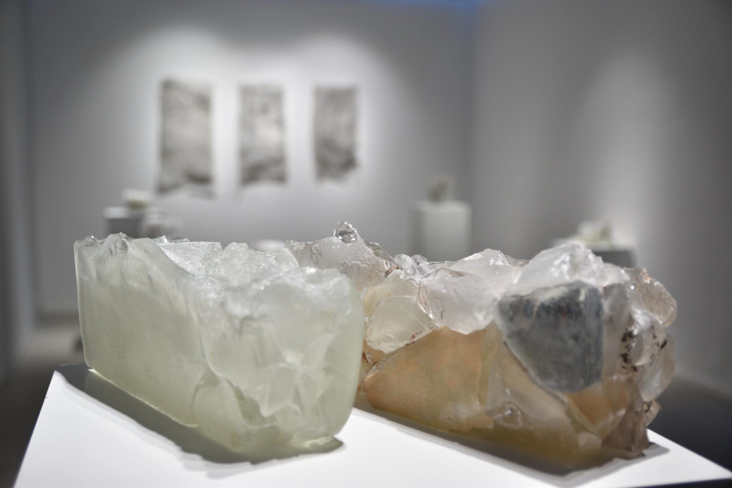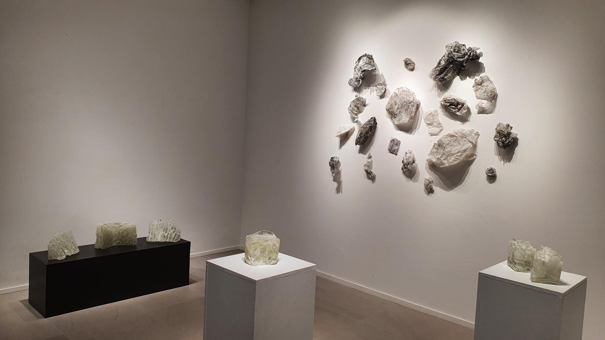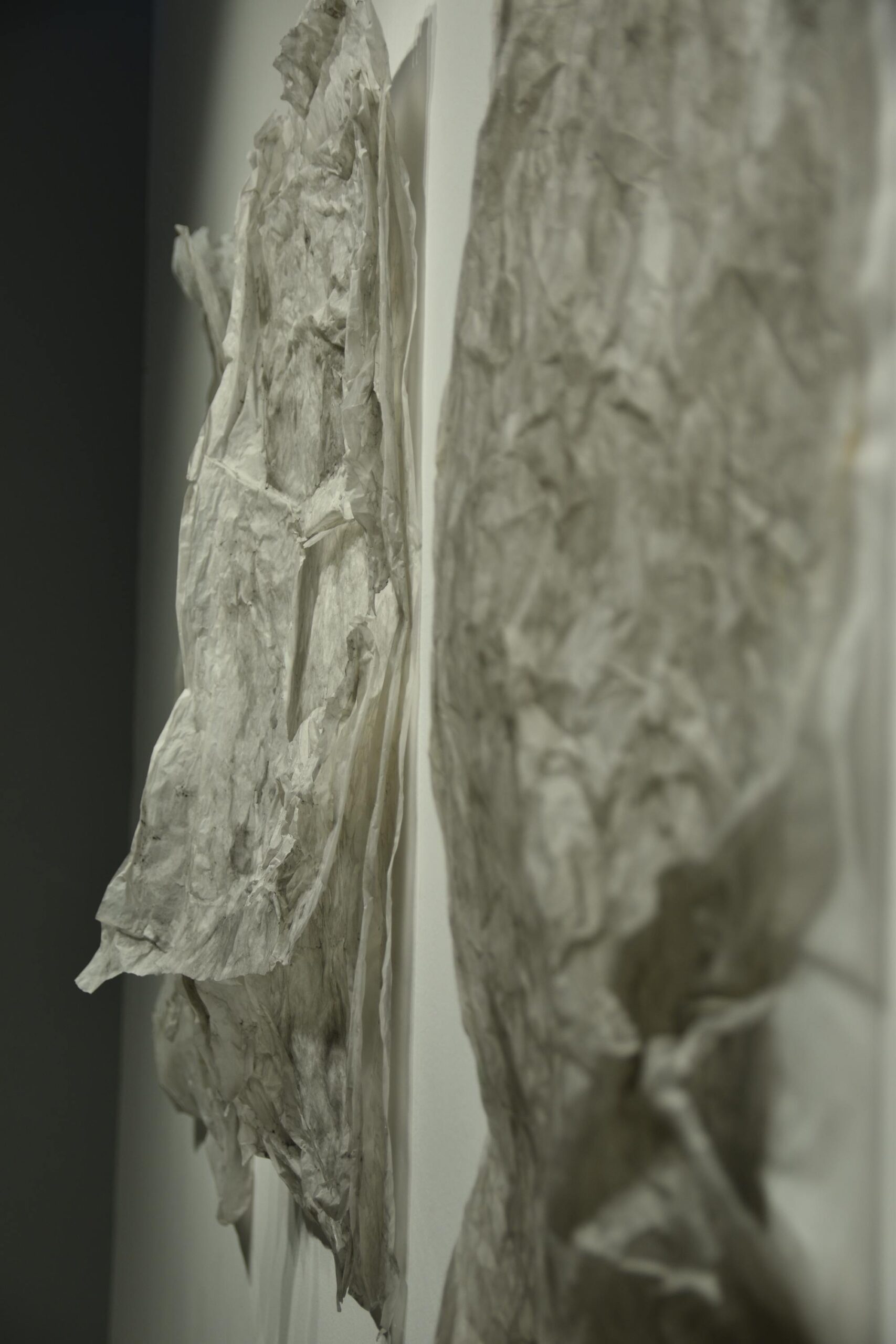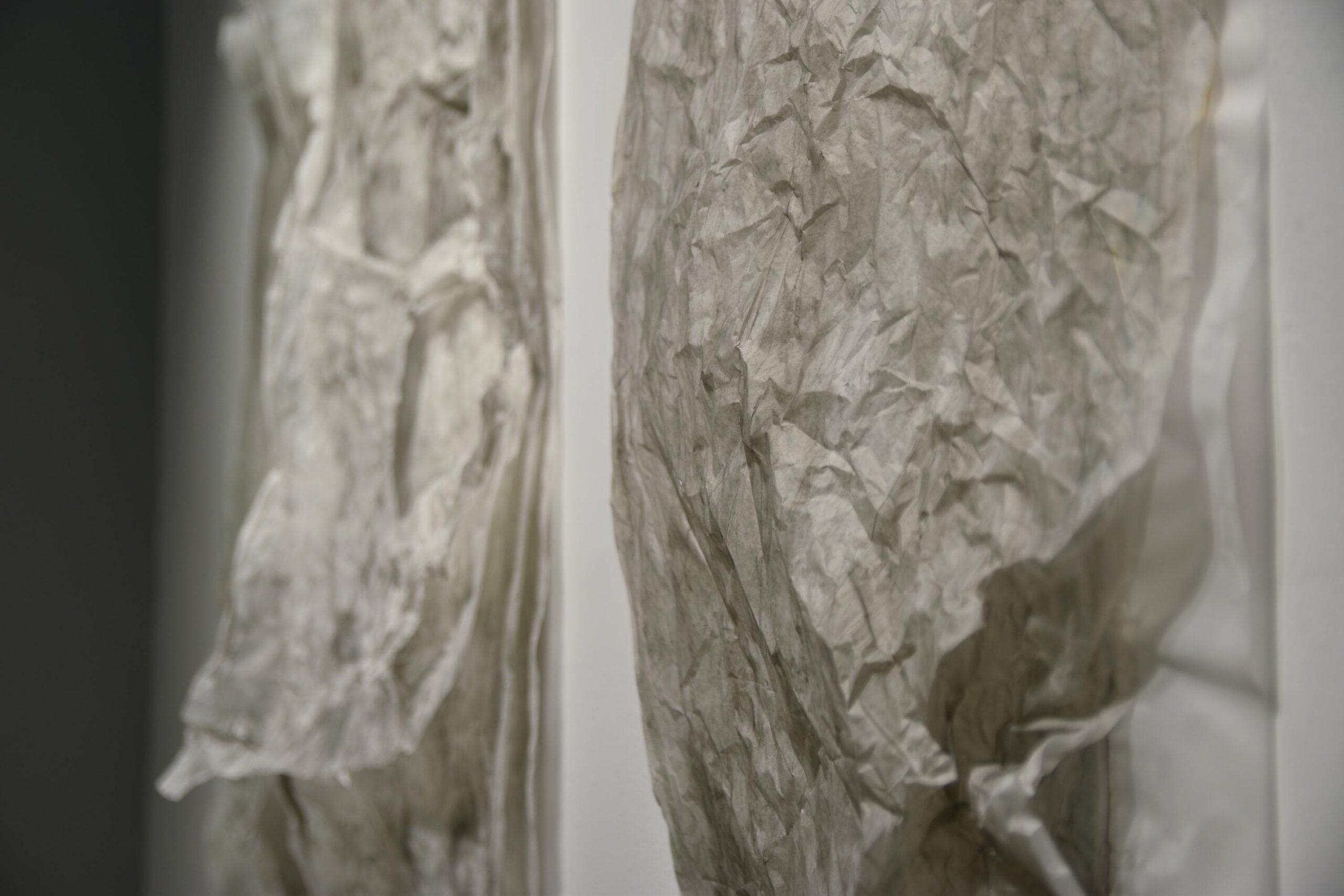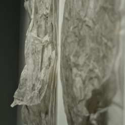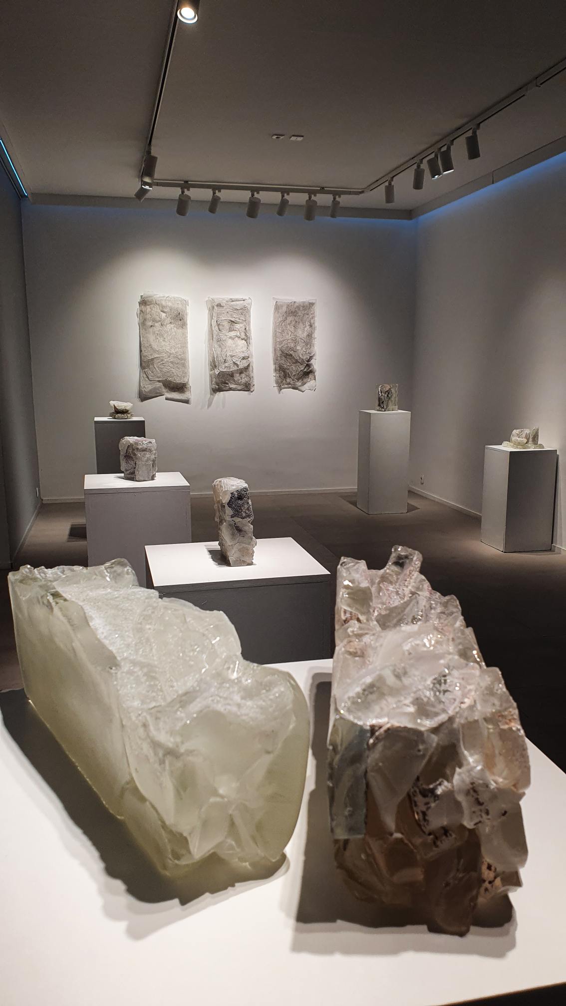 Na zidovima su predstavljeni crteži koji su često bili preteča tj. predradnja staklenim objektima, a prati ih zanimljiv proces oblikovanja. Naime, Anton Vrlić je paus papire močio u vodi te ih je punio laviranim tušem, a kada su se osušili i očvrsnuli nastajali su začudni reljefi i vizure koje svojom trodimenzionalnošću, teksturama i površinskim strukturama nose mnoge karakteristike staklenih objekata. Crteži različitih veličina i oblika variraju od posve minimalističkih, pročišćenih i suptilnih rješenja do krajnje prigušenih varijanti. Riječ je o lirskoj apstraktnoj igri koja u potpunosti korespondira sa staklenim objektima.