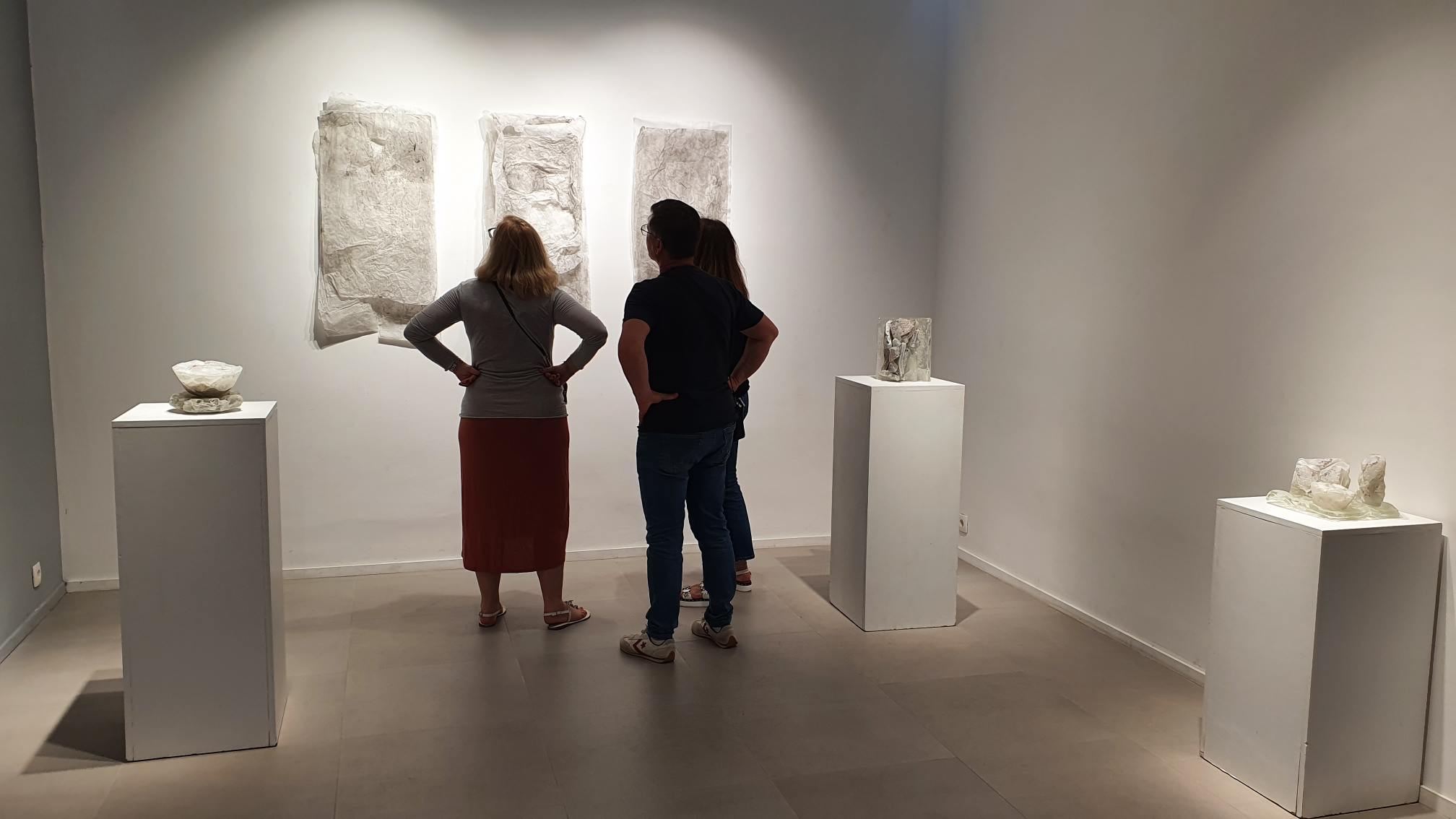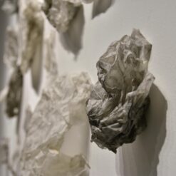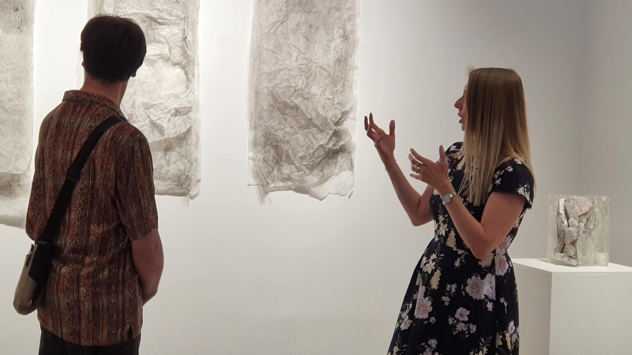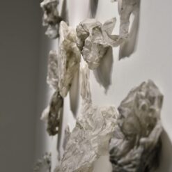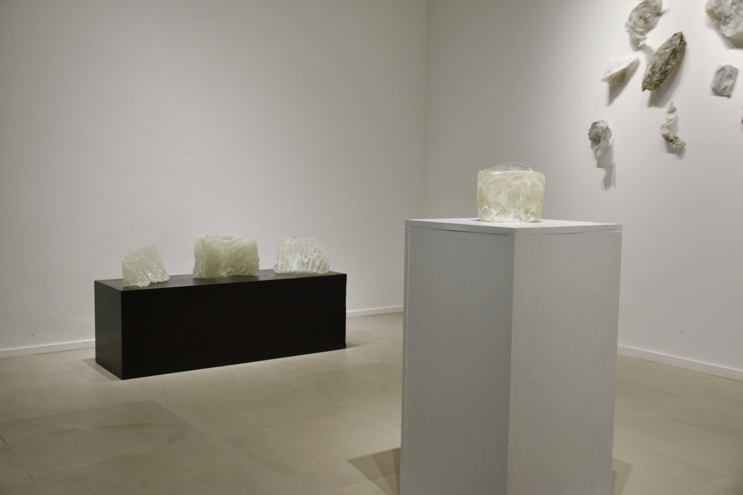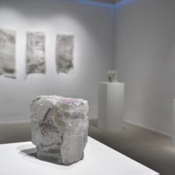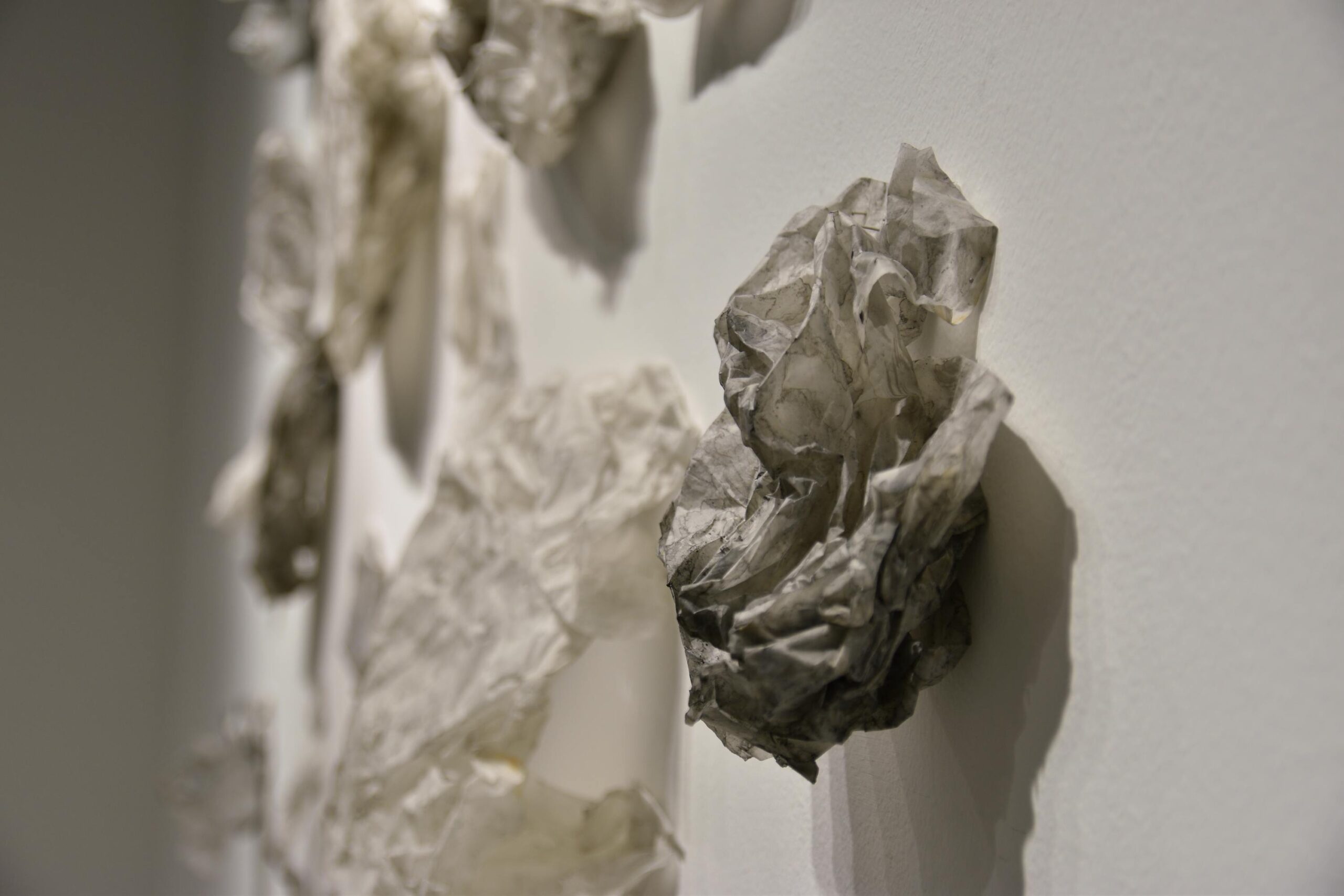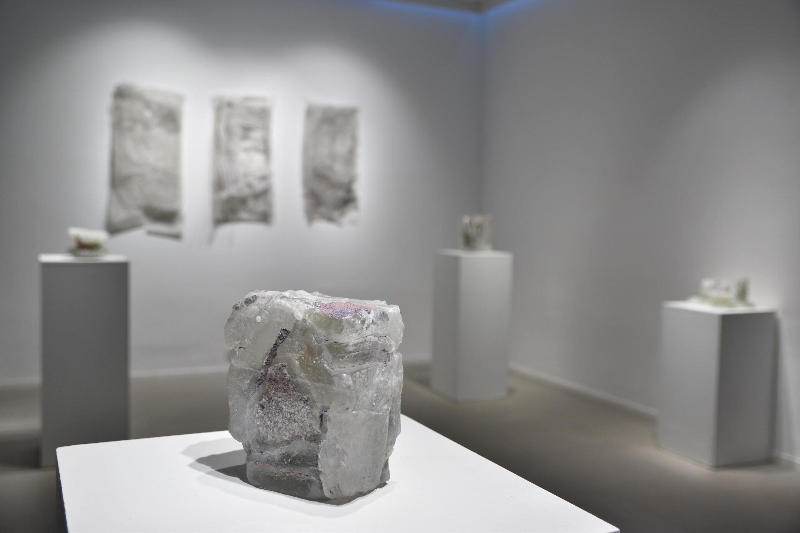 Na zidovima su predstavljeni crteži koji su često bili preteča tj. predradnja staklenim objektima, a prati ih zanimljiv proces oblikovanja. Naime, Anton Vrlić je paus papire močio u vodi te ih je punio laviranim tušem, a kada su se osušili i očvrsnuli nastajali su začudni reljefi i vizure koje svojom trodimenzionalnošću, teksturama i površinskim strukturama nose mnoge karakteristike staklenih objekata. Crteži različitih veličina i oblika variraju od posve minimalističkih, pročišćenih i suptilnih rješenja do krajnje prigušenih varijanti. Riječ je o lirskoj apstraktnoj igri koja u potpunosti korespondira sa staklenim objektima.