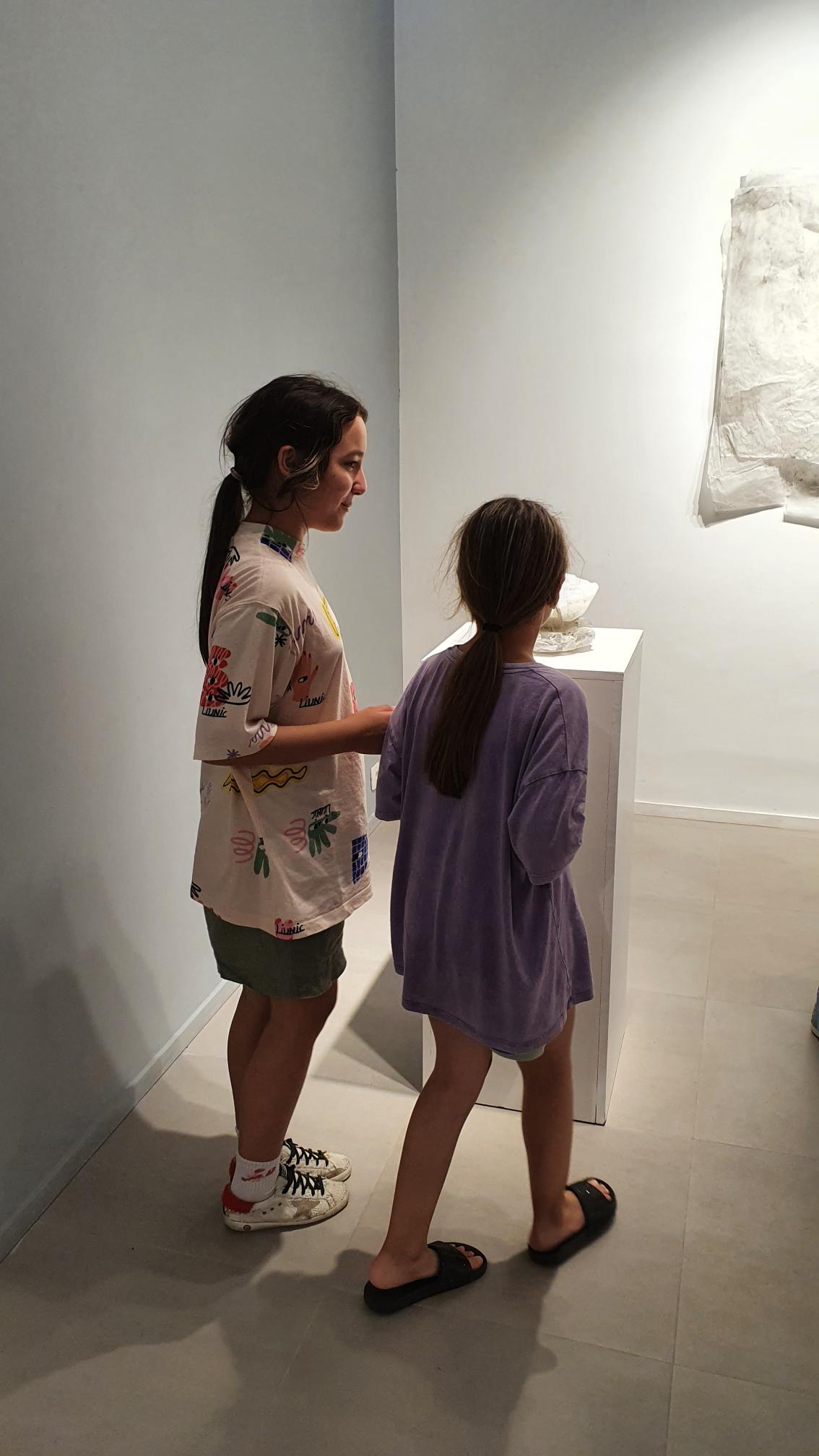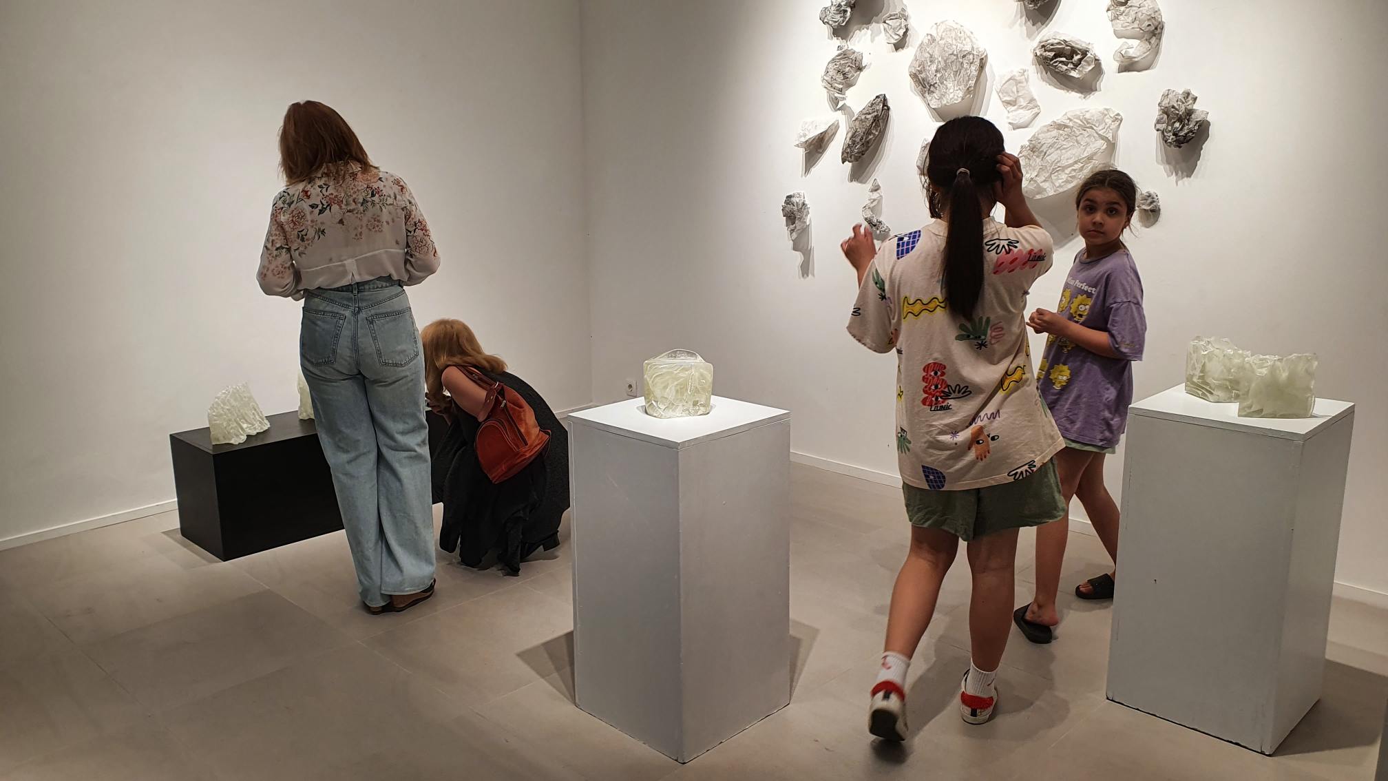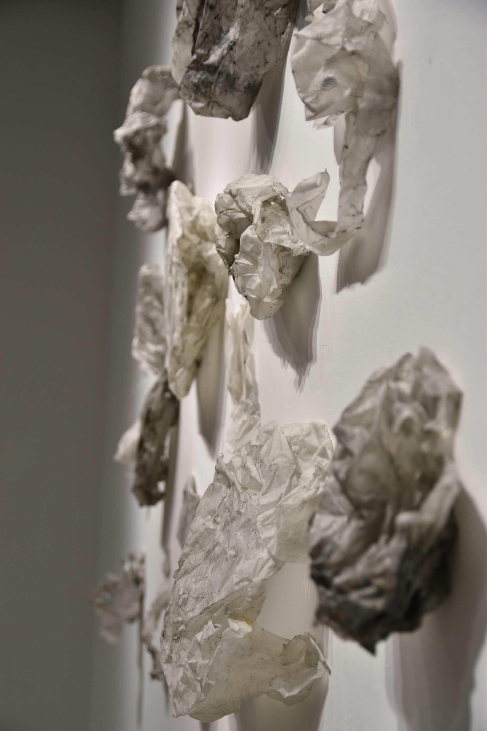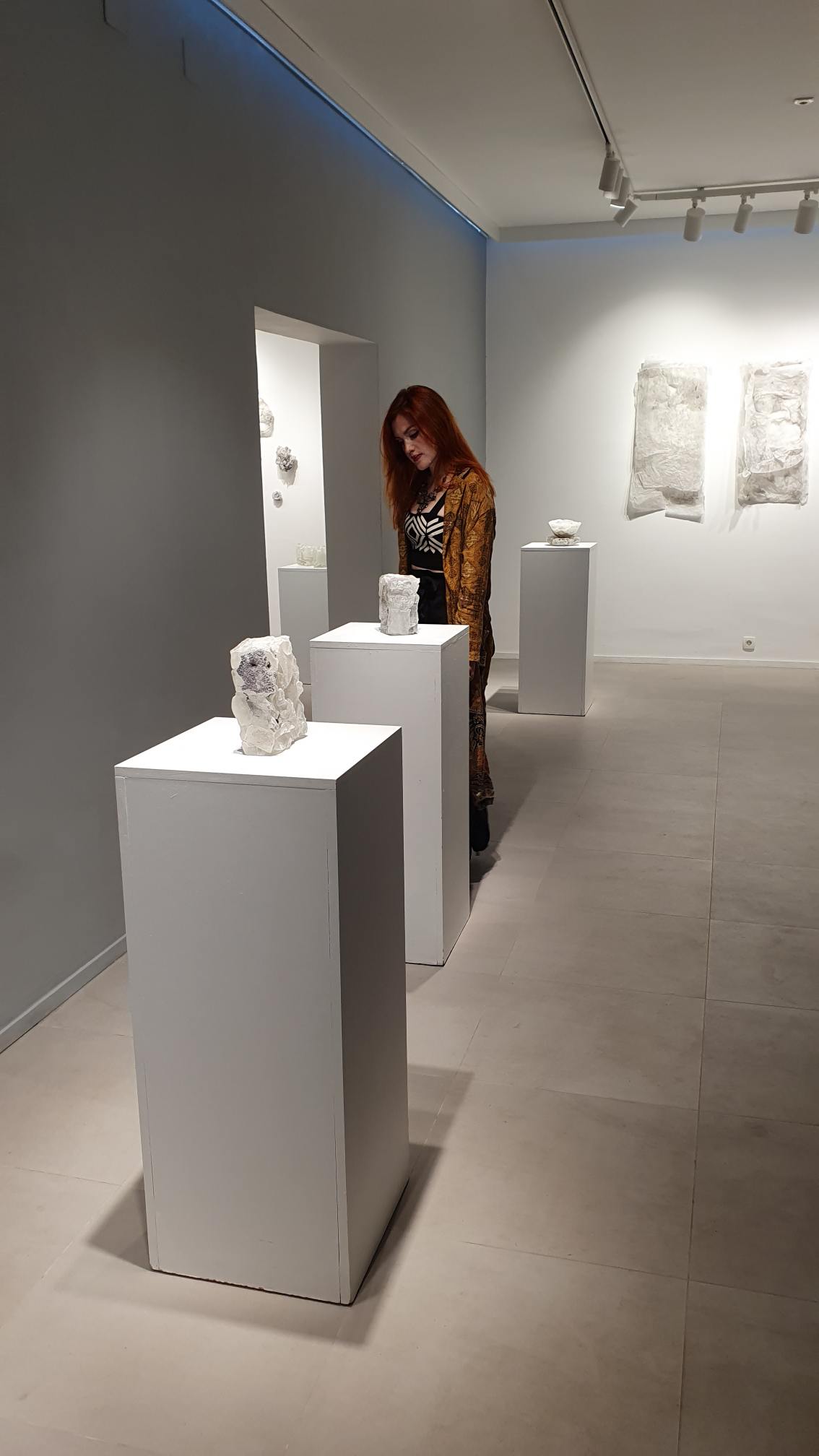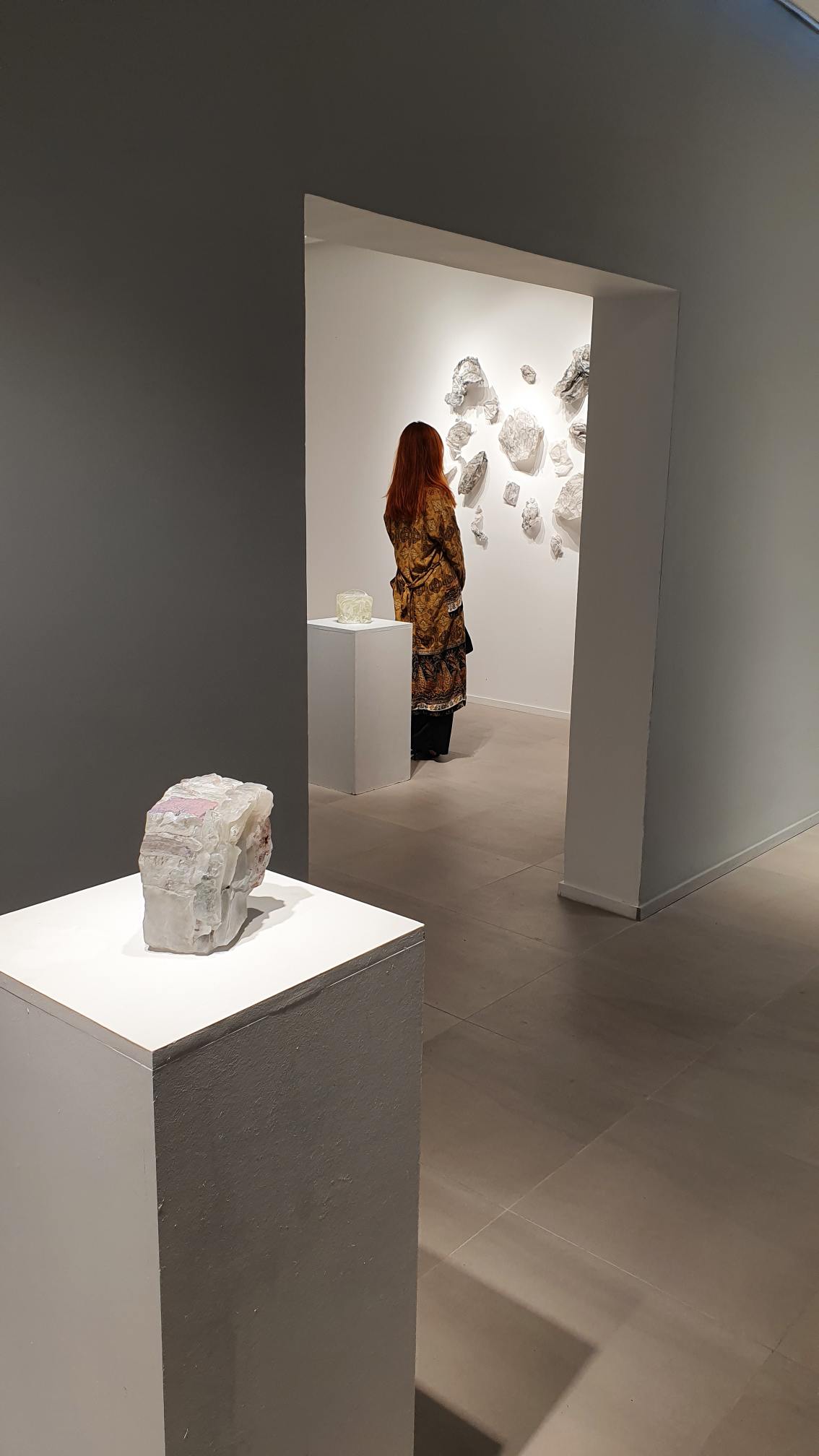 Na zidovima su predstavljeni crteži koji su često bili preteča tj. predradnja staklenim objektima, a prati ih zanimljiv proces oblikovanja. Naime, Anton Vrlić je paus papire močio u vodi te ih je punio laviranim tušem, a kada su se osušili i očvrsnuli nastajali su začudni reljefi i vizure koje svojom trodimenzionalnošću, teksturama i površinskim strukturama nose mnoge karakteristike staklenih objekata. Crteži različitih veličina i oblika variraju od posve minimalističkih, pročišćenih i suptilnih rješenja do krajnje prigušenih varijanti. Riječ je o lirskoj apstraktnoj igri koja u potpunosti korespondira sa staklenim objektima.