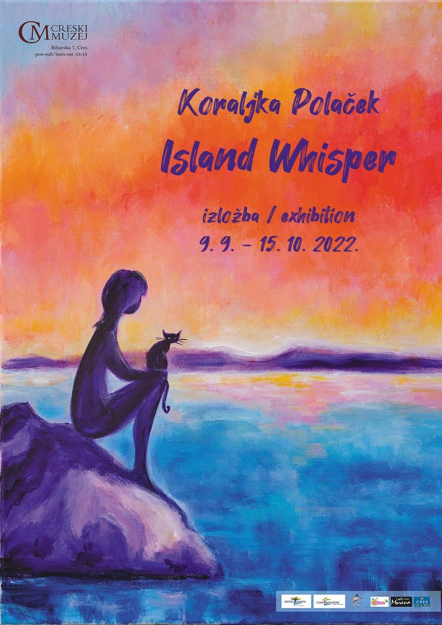 Akademska slikarica Koraljka Polaček izlaže sklop slika ISLAND WHISPER – „Otočka šaputanja“ u Creskom muzeju, kao dio svojeg ciklusa „Mačkoslike“. Prikazi su to utihlog primorskog grada, kuća, ulica, volti, lučica, mora, neba i životinja, uvijek prisutnih mačaka, koje na svakoj slici imaju svoje mjesto u noćnom ili sutonskom ugođaju. Autorica već godinama humanitarno pomaže mačkama, tako su one postale neizbježni „stanovnici“ slika, tog fantazmagoričkog svijeta. Sjene starog grada izražavaju ikonografiju sna; prožimanje svijeta stvarnosti i mašte, dok mačke, jedna ili više njih, kao promatrači traju poput uvijek prepoznatljivog znaka. U prostorima nadrealne arhitekture ili pretvorenima u fluid bespuća i daljina, kao i u intimnim isječcima, poznatima samo Koraljki Polaček, živi bestijarij što spaja ljudsko i životinjsko, svijet alternativnih i paralelnih zbivanja, gdje mogućnosti postaju zbilja.