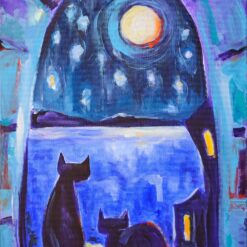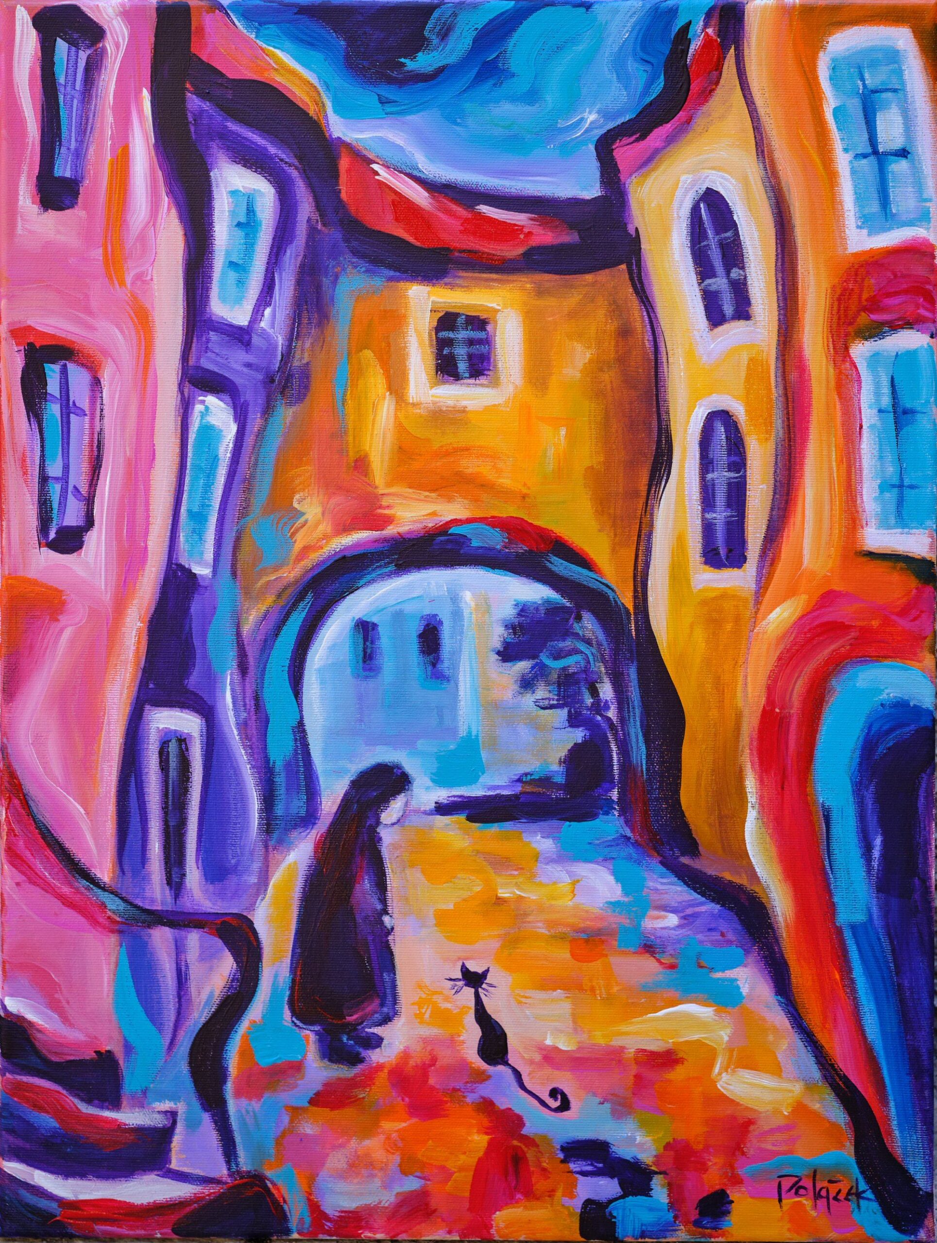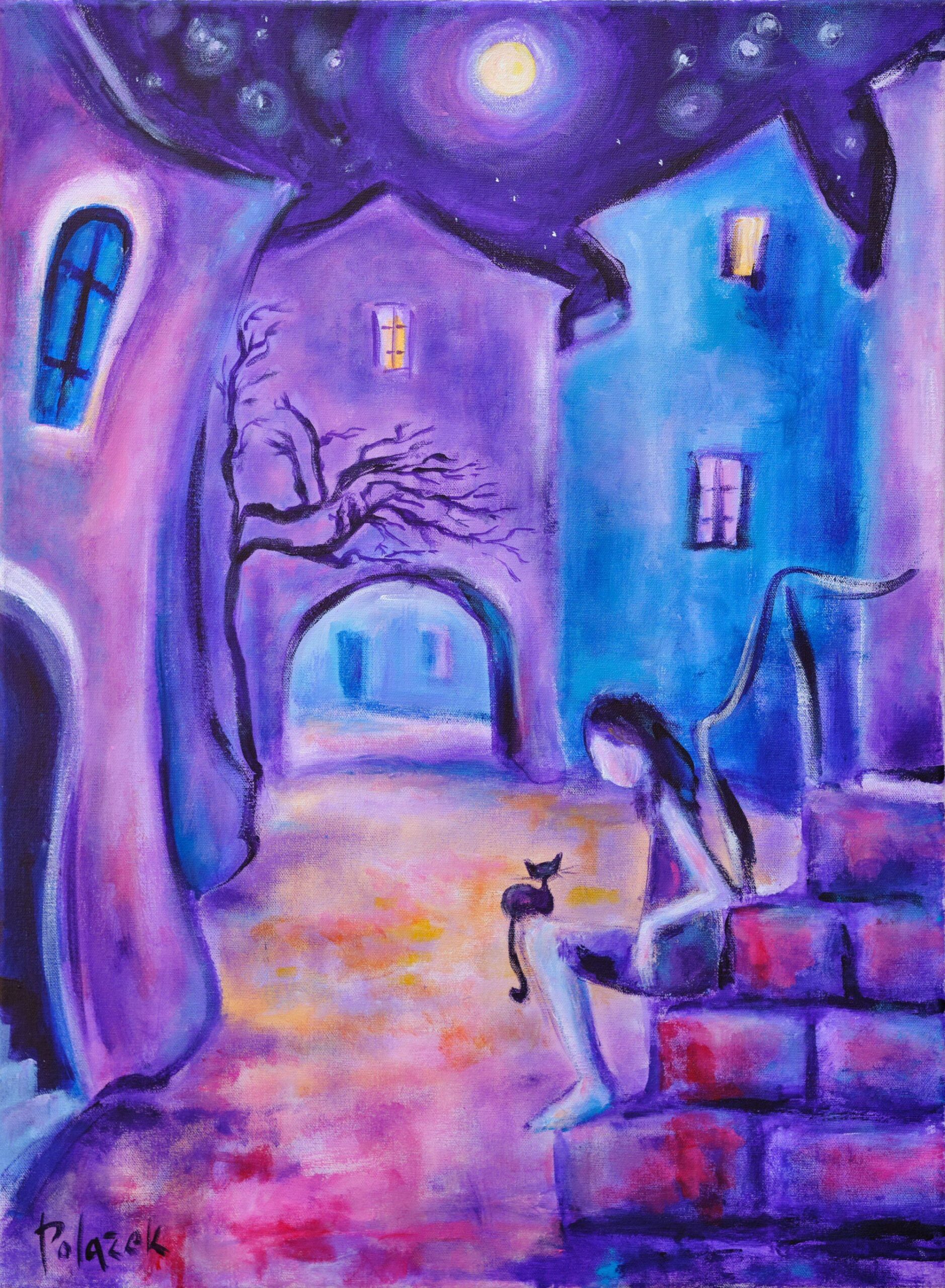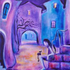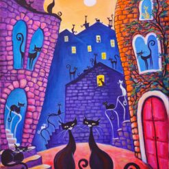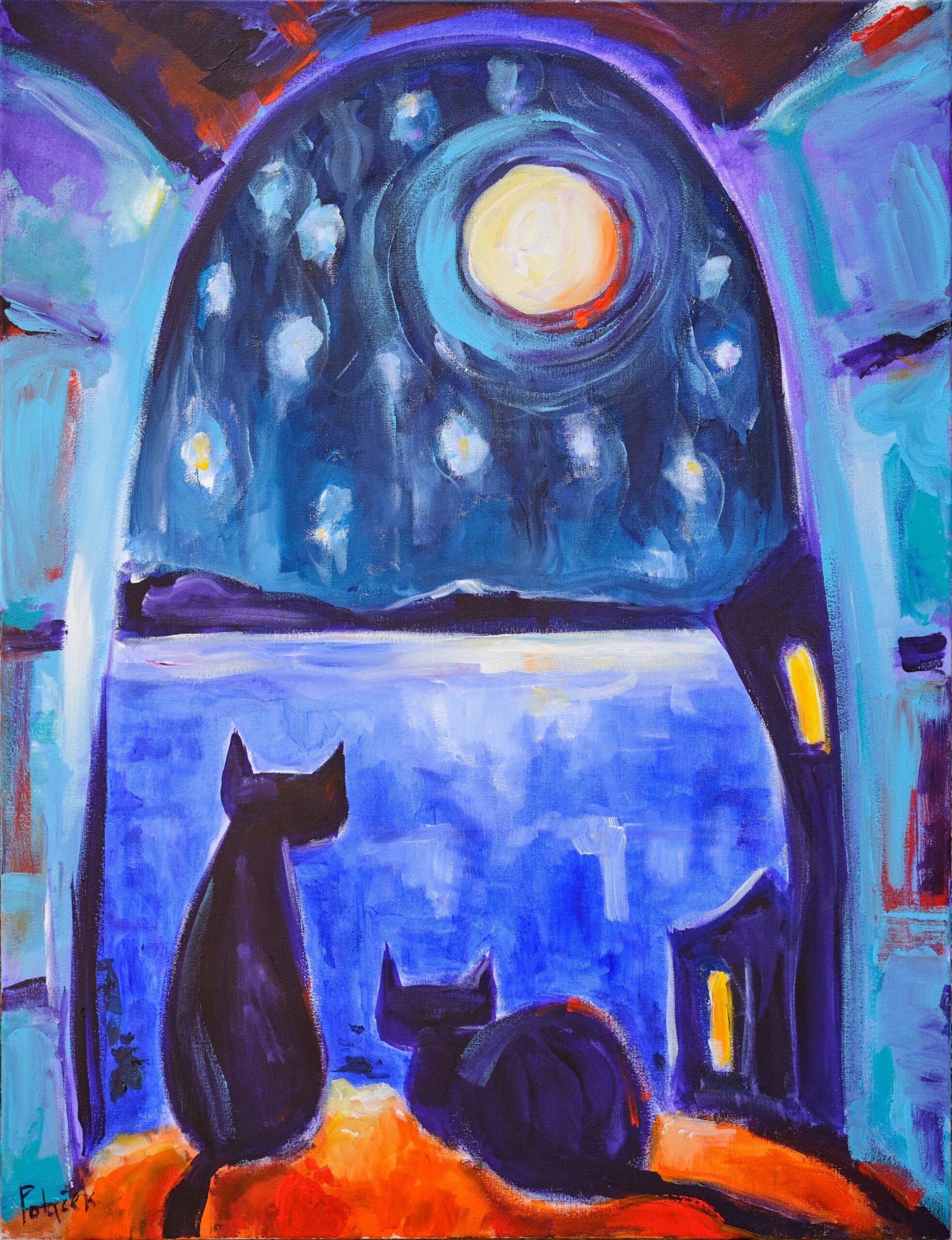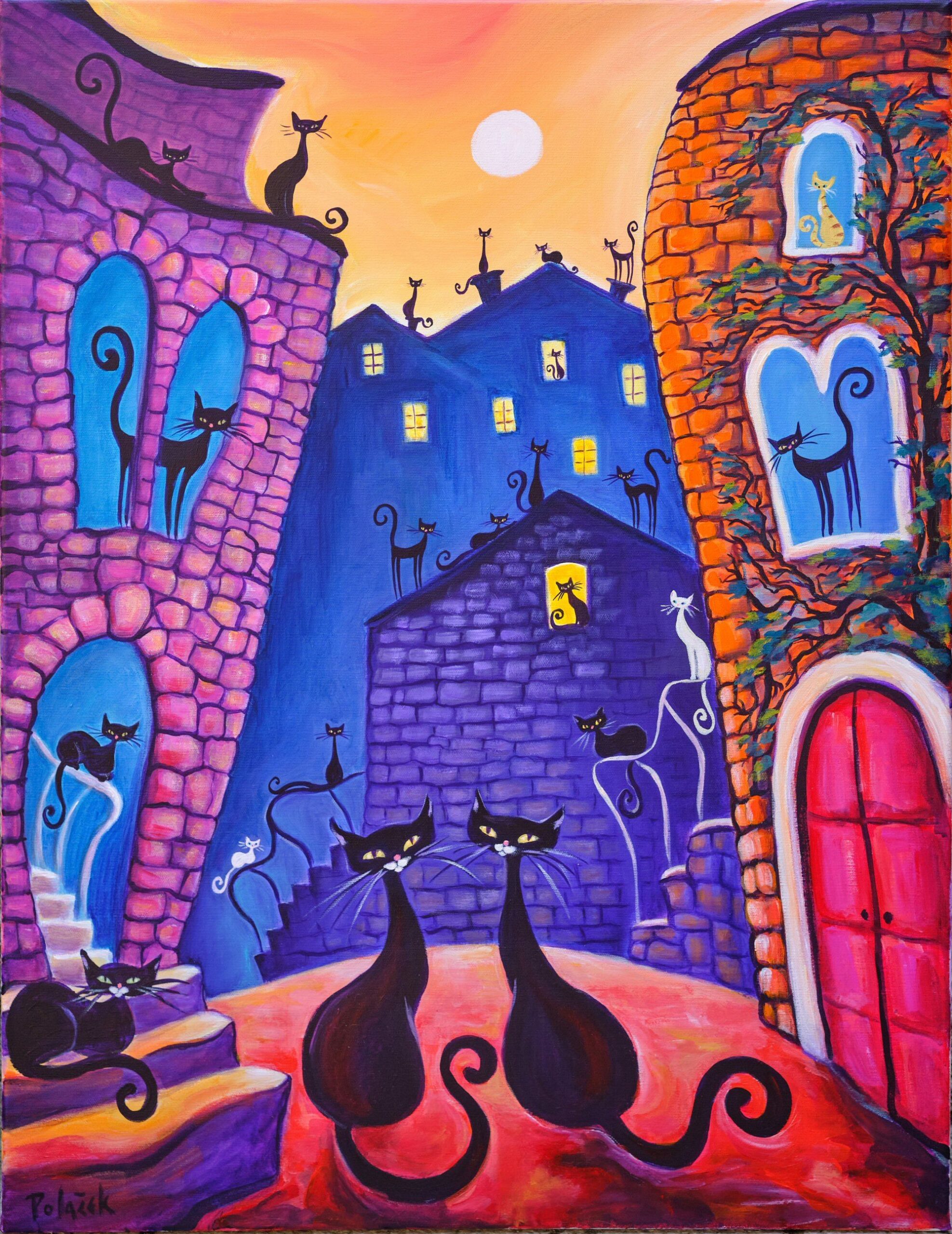 Većinom slika vlada noć. Mačka je biće noći, izoštrava se njen sluh, njuh, vid, budi se lovački zov. U radovima mačke su na žuto osvijetljenim ili zaplavljenim prozorima, na krovovima, stubama, rukohvatima, balkonima, lučicama, ulicama, jedna ili više njih, u parovima promatraju blijedožuti ili narančasti puni mjesec, koji bjelinom ostavlja trag na moru. Svaka od mačaka ima svoju osobnost, one su poput arabeske, zašiljenih ušiju, šire glave, naglašenih brkova, različitih tjelesa, dugih uvinutih repova i žarkih žutih očiju. Mačke, zajedno s punim mjesecom i „životom zbijenih kuća“ stvaraju okomitu otvorenu os središtem slike. Tu okomitu os, otvarajući prostor, na nekoliko slika, naglašavaju i volte između kuća. „Život primorskih kuća“ je poput živih bića; sljubljene jedna uz drugu, preklapaju se i pretapaju, dok su obrisne linije ili oštre ili se uvijaju u zaobljenosti, bez težnje stvaranja dubljeg prostora slike. Arhitektura u bogatom koloritu teče poput razlivene boje. Na šest slika tamno plavetnilo zvjezdanog neba zamijenjeno je crvenim, narančastim, žutim, bijelim, bojama zalaska Sunca, ali Sunce se ne vidi. Tako je i sa prikazom ljudskog lika, on izostaje u gotovo cijelom sklopu slika, tek su ih četiri: blijeda djevojka noću sjedi na stubama, tamna neodređena djevojka zagledana u zalazak Sunca, i dvije crne „nonice“, jedna sa psom, ispred gradskih volti, tek naznačene, okružene žarkim bojama zaobljenih građevina.
