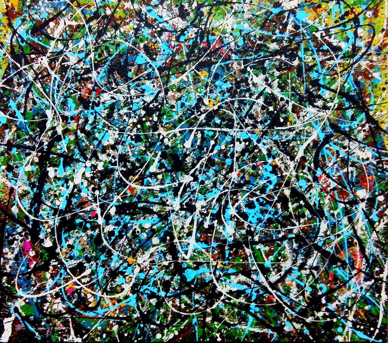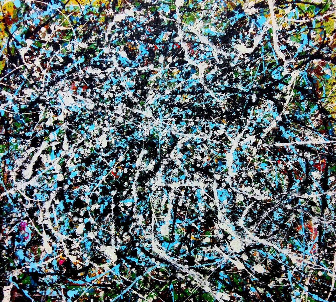 Pa i u situaciji kada kontemplira o slikarstvu velikog Pollocka, Žunjić gradi sliku nizom svojih poteza, nizom svojih kompozicijskih rješenja, istodobno odajući priznanje velikanu na njegovu nenadmašnom djelu.