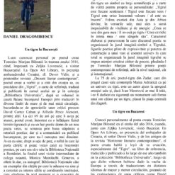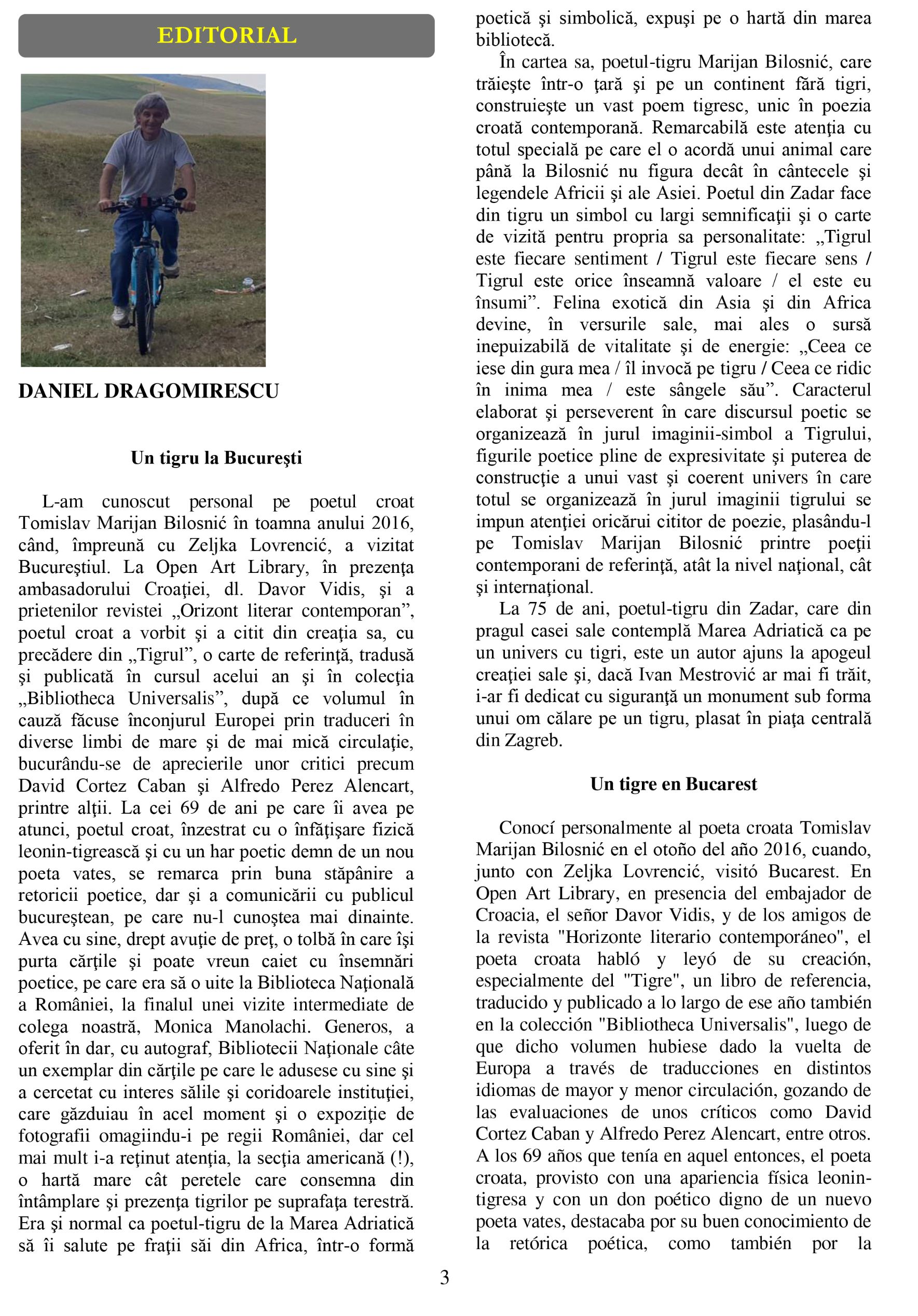 Višejezični rumunjski časopis za književnost i umjetnost „Orizont literar contenporan“, koji izlazi u Bukureštu, svoj je uvodnik u posljednjem ovogodišnjem, ljetnom broju – godište XIV, broj 4(90) – posvetio životnom i umjetničkom jubileju hrvatskog pjesnika Tomislava Marijana Bilosnića. Uvodnik pod naslovom „Tigar u Bukureštu“ je objavljen na rumunjskom, španjolskom i francuskom jeziku, a potpisuje ga Daniel Dragomirescu, urednik časopisa, poznati rumunjski pjesnik i izdavač. Prevoditeljica teksta na francuski jezik je poznata francuska pjesnikinja Noëlle Arnoult, koja živi u Dijonu, dok je tekst na španjolski prevela Monica Dragomirescu.