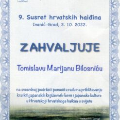 Zahvalnicu Tomislavu Marijanu Bilosniću na svesrdnoj podršci i pomoći u radu na približavanju kratkih japanskih književnih formi i japanske kulture u Hrvatskoj i hrvatskoga haikua u svijetu