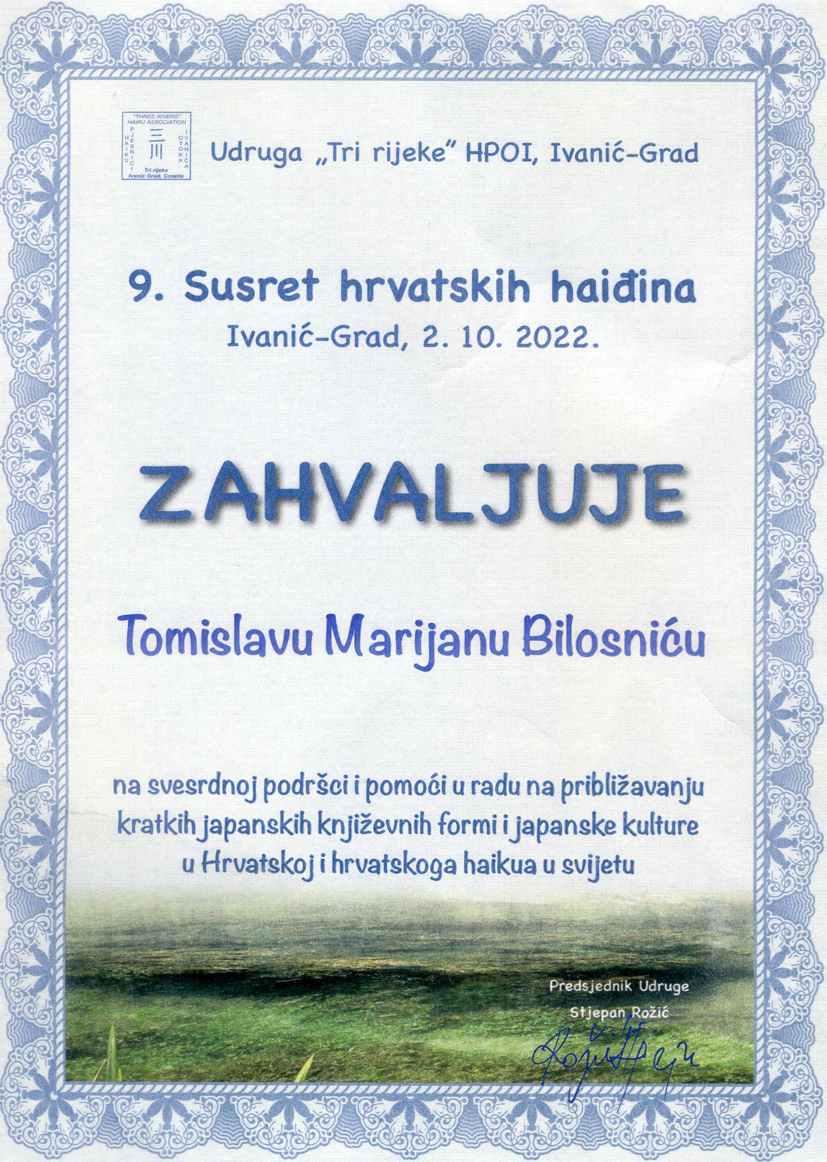 Udruga „Tri rijeke“ HPOI, Ivanić-Grad. Na 9. Susretima hrvatskih haiđana i Ivanić-Gradu, 2. listopada 2022. godine dodijelilo je i Zahvalnicu Tomislavu Marijanu Bilosniću na svesrdnoj podršci i pomoći u radu na približavanju kratkih japanskih književnih formi i japanske kulture u Hrvatskoj i hrvatskoga haikua u svijetu. Zahvalnicu potpisuj predsjednik Udruge, poznati i nagrađivani haiku pjesnik Stjepasn Rožić.