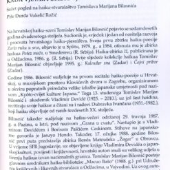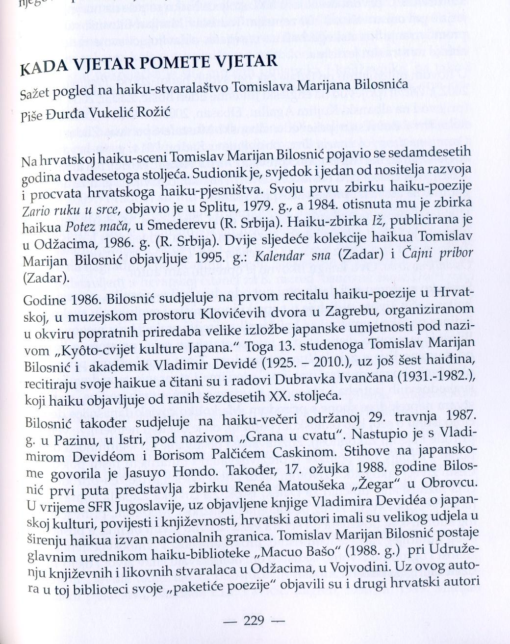 Đurđa Vukelić Rožić uz uvodnik i više autorskih tekstova donosi i već prilog „ Kada vjetar pomete vjetar“, sažet pregled haiku- stvaralaštva Tomislava Marijana Bilosnića, a posvećem životnom i stvaralačkom jubileju ovog autora. Tekst je objavljen na punih šest stranica časopisa.