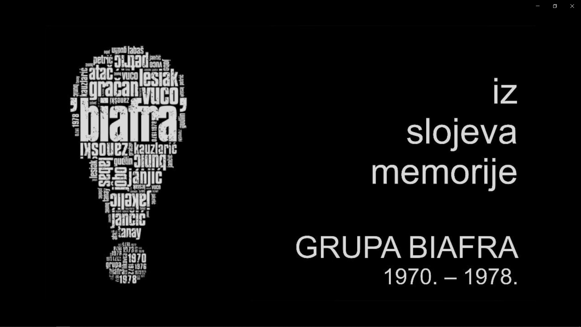Pred nama je osobno obojen projekt koji traži koncentraciju, uživljavanje, ali koji nam proširuje horizonte vezane na situacije tijeka povijesti umjetničkih događanja u našoj državi. Iako je Republika Hrvatska tada bila u sastavu Jugoslavije, ovi događaji prelili su se značenjem i na druge teritorijalne destinacije ove, kasnije nacionalističkim interesima raskomadane cjeline. Jer, izložbe ovog pokreta, grupe Biafra, bili su skoro cijelo desetljeće predstavljani na mnogim lokacijama cjelokupne bivše države.