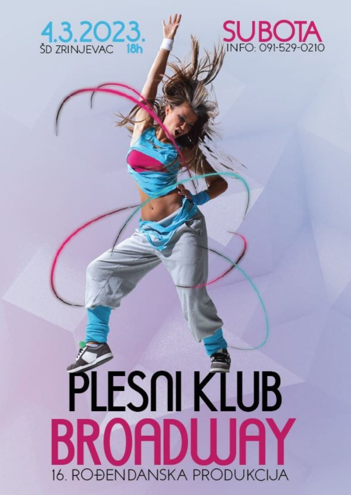 U subotu, 4. ožujka 2023. s početkom u 18:00 sati u dvorani Zrinjevac održat će se 16. rođendanska produkcija plesnog kluba Broadway. Svojim dolaskom pokažite podršku radu Plesnog kluba Broadway. Zabava i odličan ples su zagarantirani. Plesni klub Broadway osnovan je 2007. godine u svrhu promicanja plesne kulture i sporta na području grada Osijeka i okolice.