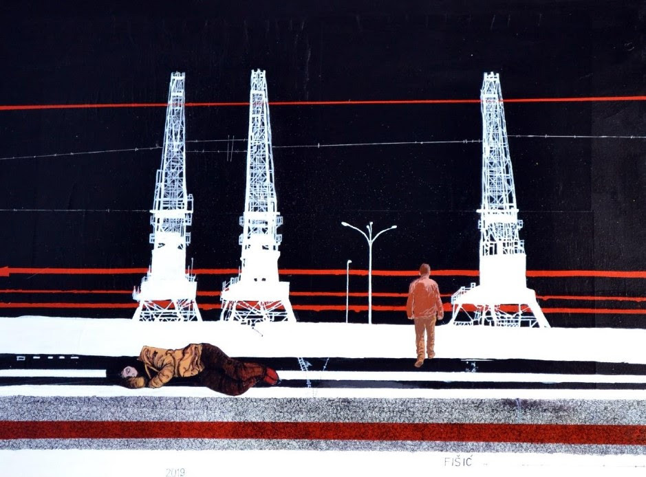 Riječima kustosice izložbe Dijane Ososlije: „U radovima je stalan motiv prolaznika, ljudske figure koja kao da se zatekla usred postapokaliptičnog prizora. Taj prizor čine eksterijeri gradilišta, automobilske i brodske olupine, prometna infrastruktura. Sam prolaznik nemoćan je usred zatečenog stanja te kao da niti ne pripada svijetu u kojem se trenutno našao. Taj svijet nije njegov svijet već kao da je dio nekog paralelnog svemira, u kojem supostoje on – prolaznik i vrijeme, koje kao da je stalo. Prizori pomalo podsjećaju na negativ fotografije, gdje slika još uvijek nije konačna, već je to neki međuprostor ili prostor međuslike.”
