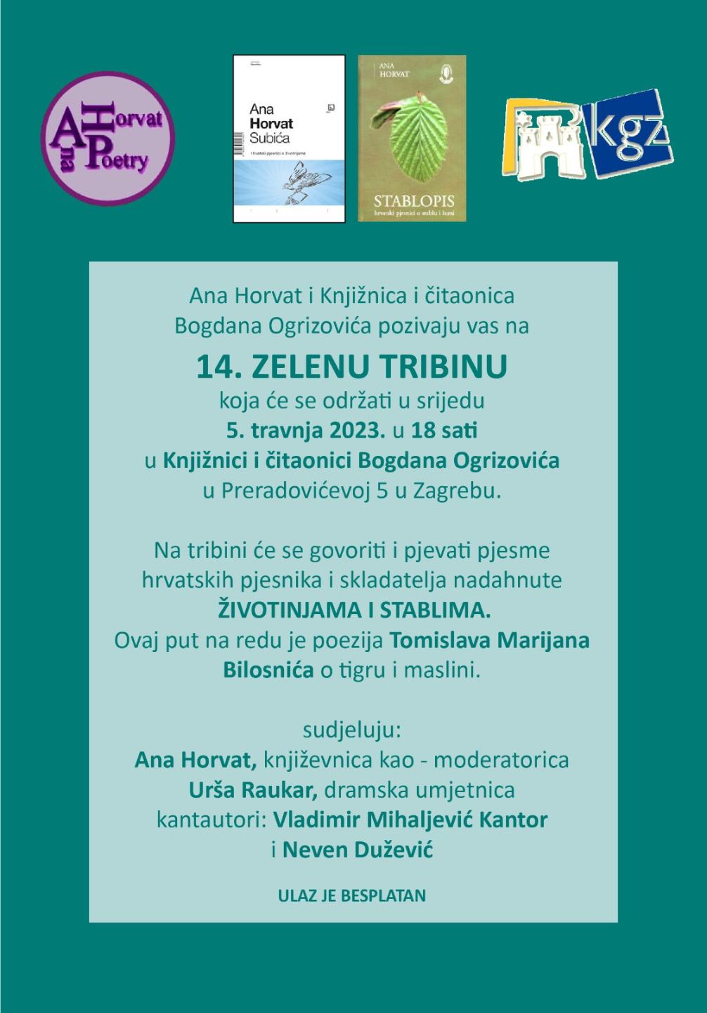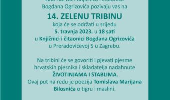 U srijedu 5. travnja 2023. godine s početkom u 18 sati, u knjižnici i čitaonici „Bogdan Ogrizović“ u Zagrebu, održana je 14. ZELENA TRIBINA, u kojoj se govorilo o životinjama i stablima, a koju uređuje i vodi književnica Ana Horvat, koja je istu i pokrenula.