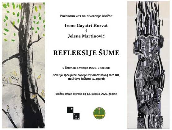 Iniciran ljubavlju prema prirodi i šumi, ujedinjuje ga istovjetni motiv i crtačka virtuoznost autorica. Stoga se, u Refleksijama šume kako i naslovljavaju sam izložbeni koncept, reflektiraju umjetničke osobnosti samih autorica, pozivajući nas „da se i sami resetiramo na zdrave osnove od kojih nas udaljava užurbani način života, da promislimo o sebi i o prirodi koje smo neodjeljivi dio“. Neodjeljivi kao što su i materijali koje koriste neodvojivi od samog stvaralačkog procesa i određenih tehnika, koje obje autorice koriste slijedeći slobodu odabira i kombiniranja kao vlastiti imperativ. Tako Gayatri na slikarskom platnu crta i „slaže“ svoje linoreze, a Jelena slika akrilom na papirnatoj podlozi. U toj slobodi kombiniranja izričaja reflektira se njihov slobodarski duh, izravan i snažan utjecaj koji na njih vrši priroda, formirajući njihov svjetonazor i estetske stavove koje one prenose u neprirodni prostor galerije poništavajući granicu prirodnog i umjetnog(arhitektonskog) u kojem bivaju angažirana naša vizualna ali i auditivna osjetila. Jer Gayatri i Jelena stvaraju ambijentalno djelo kojim, ispitujući oblike, boje, mirise i zvukove prirode, formiraju mjesto koje potiče posjetitelja i omogućava mu doživljaj na više perceptivnih razina. Izlazeći iz same domene likovnog upotpunjavaju izložbu video uradcima obogaćenim zvukovima prirode i glazbom, koji od promatrača zahtijevaju sudjelovanje i posebnu duhovnu koncentraciju. A u središnji dio galerije, aludirajući na pokrete i titraje lišća, postavljaju svoje crtačko-grafičke mobile, gradeći svoju posebnu „likovnu šumu“ u kojoj možemo iščitati stanja i spoznaje koje nadilaze osobno i postaju refleksije univerzalnih vrijednosti. A kako šume ne bi živjele samo u našim snovima, slikarice Irena Gayatri Horvat i Jelena Martinović svojim slikama, crtežima i grafikama kreiraju svijet u kojem pred našim očima spretno udružuju prirodno i arhetipsko s produktima suvremenog. Kao u Jeleninim animacijama u kojima se pomoću aplikacija Artivive oživljeni preklapaju skenirani prizori njezine slike i fotografije, ili u video uradcima u kojima Gayatri oživljava svoje stihove u čudesnoj glazbenoj simbiozi s kompozitorom Simonom Skalarom. Postajući tako ravnopravne brojnim recentnim eko projektima, koji apelirajući na život u skladu s prirodom, osvješćuju njezinu važnost i sve što nam ona beskompromisno nudi. Sada, u čudesnom svjetlucanju, u refleksijama šume.