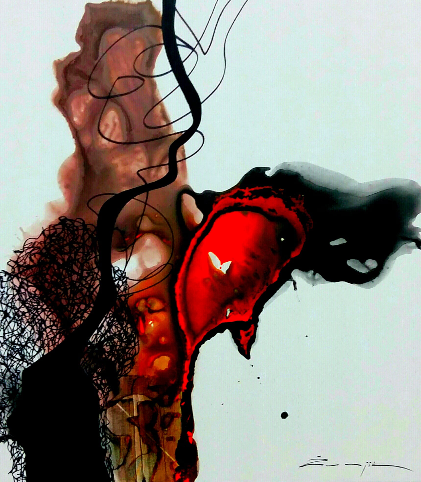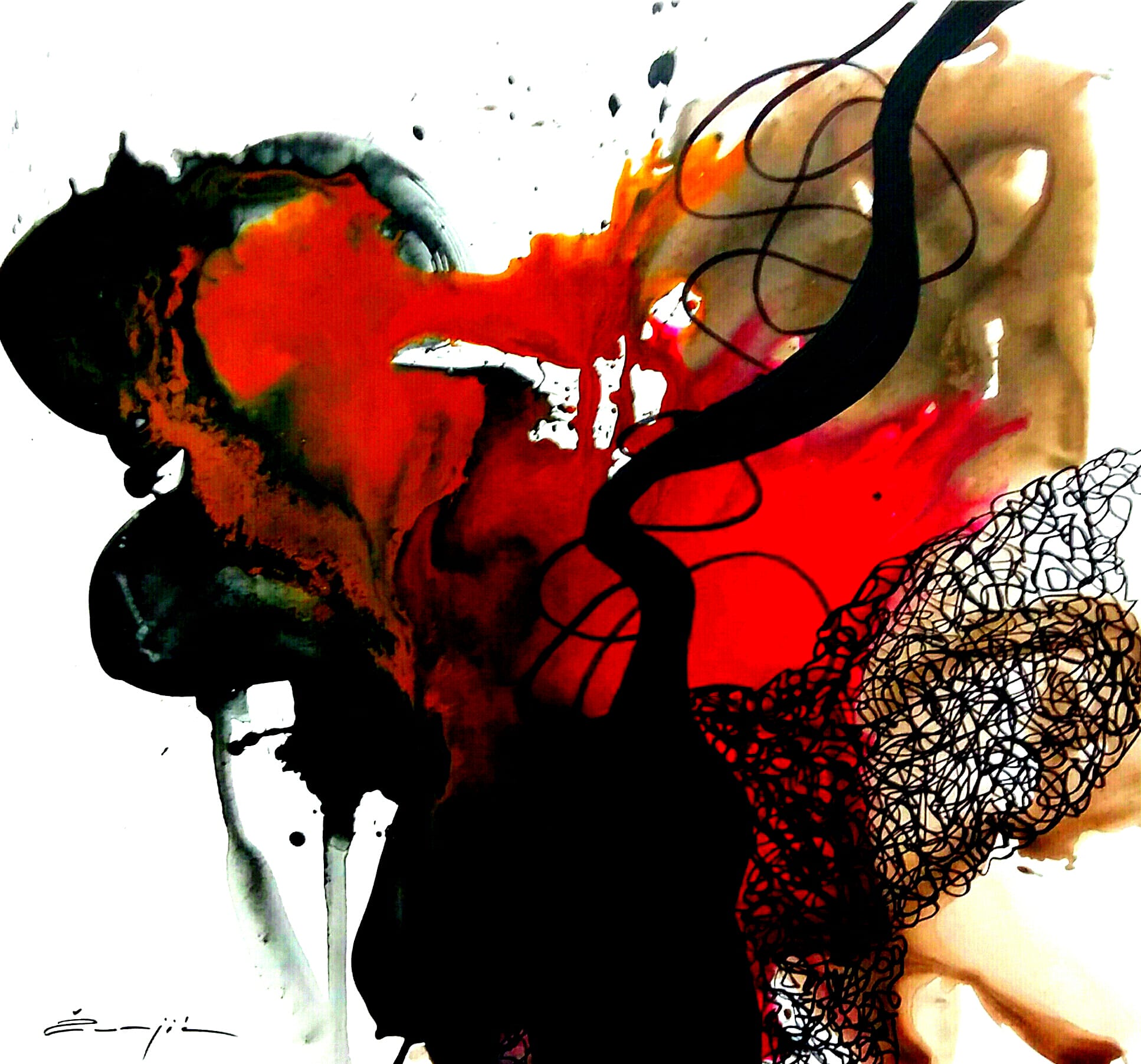 Crna, krivudava linija podjele razdire organski sklop, umjetno i namjerno ga pretvarajući u vlastitu dvojnost, ne lomeći plohe i forme boja.