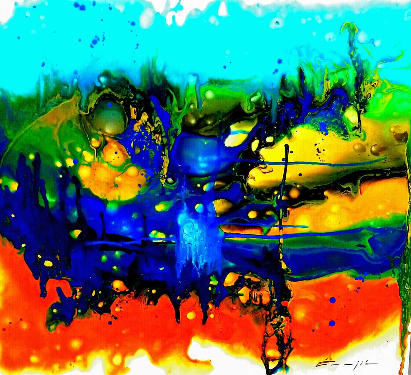 Promatrajući novi ciklus tekućih akrila, zatičem se u razmišljanju, čini mi se, kao da se mlazovi, plohe, mrlje i dalje kreću, slijedeći skrivene nagone, u pokušaju da dostignu nevidljive udaljenosti.