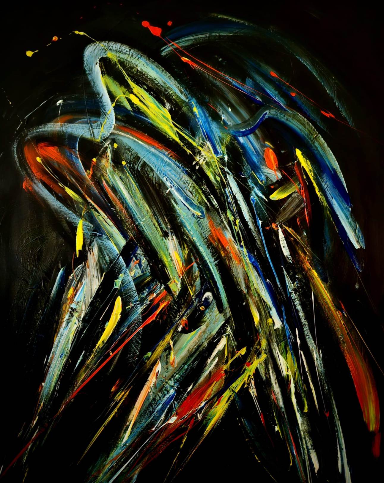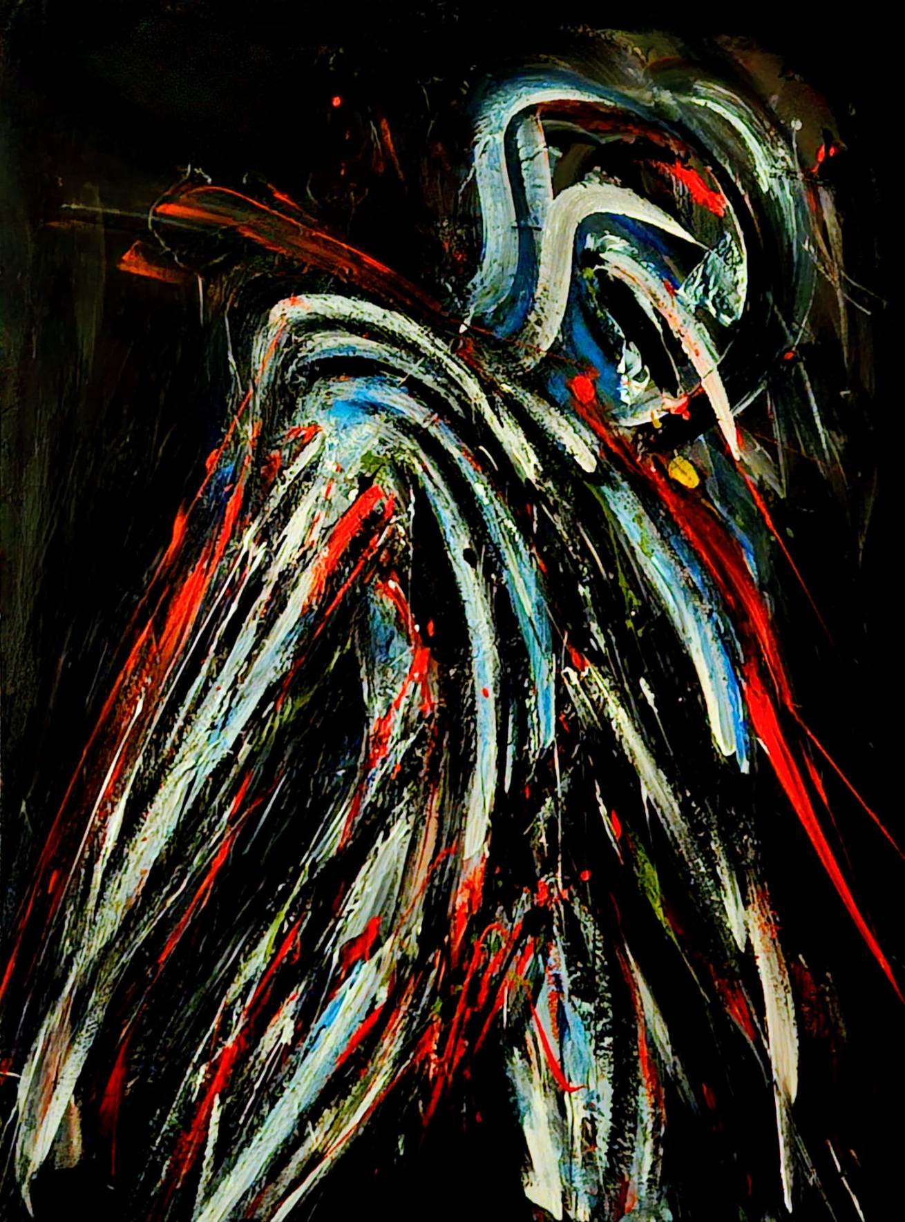 Ipak u tim se vrlozima razabiru, donekle prepoznaju obrisi figura u pokretu, u grču, u ekstazi, pripijeni, bliski tjelesno, skriveni u jatima fluktuirajućih obojanih formi.