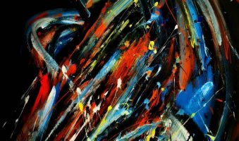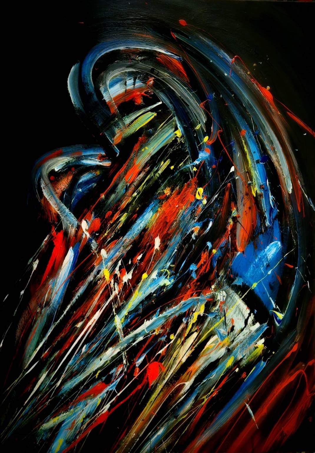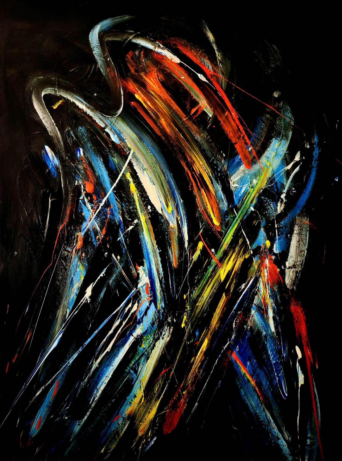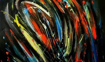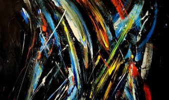Pred nama promiču uznemirujući vrtlozi fragmenata boje, odajući dojam orkana mnoštva mozaičkih fragmenata u letu raznolikih kolorističkih tragova, izvedeni u tehnici akrila na platnu na većem formatu, 100 x 75 cm.