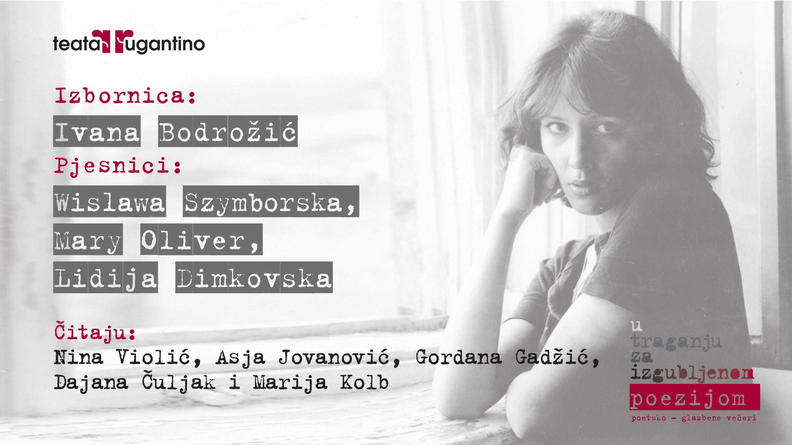 Svakog ponedjeljka od 6. svibnja pa do 1. srpnja podarit ćemo vam na YouTube kanalu Teatra Rugantino link na jednu od 10 epizoda iz našeg ciklusa. Započet ćemo 6. svibnja s moderatoricom Ivanom Bodrožić koja je odabrala pjesme Wisławe Szymborske, Mary Oliver i Lidije Dimkovske. Pjesme će čitati Nina Violić, Asja Jovanović, Gordana Gadžić, Dajana Čuljak i Marija Kolb.