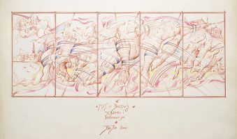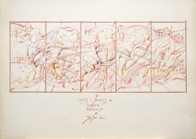 Na drugoj slici Slovinićevog “Budvanskog mita” iz 2000. godine, vidljiva je promjena medija – umjesto tuša, ovdje je korišćen krejon u boji. Odmah upada u oči mekša, fluidnija atmosfera koja je stvorena upotrebom boje. I dalje su prisutne Slovinićeve karakteristične segmentirane kompozicije, ali kolorit donosi novu dimenziju radu, dodajući toplinu i životnost. Nježne pastelne boje unose dinamičnost i vibraciju, što doprinosi emotivnom utisku djela. Segmentacija slike i dalje nagovještava različite perspektive ili fragmente priče, ali sada sa dodatkom boje, različiti djelovi još više ističu svoju jedinstvenost. Kompozicija je i dalje kompleksna, sa elementima koji se prepliću i protežu kroz različite panele, sugerišući povezanost i kontinuitet unutar mita ili istorije koju umjetnik želi da predstavi. Slovinićeva igra sa prostorom i oblicima postaje još bogatija zbog višeslojnosti koju omogućava upotreba različitih boja. Primjena boja omogućava i veću emotivnu ekspresiju, sa nežnim prijelazima i kontrastima koji se ne bi mogli postići samo crno-bijelim prikazom. Djelo odiše nekom vrstom lirskog nadrealizma, đe se stvarni elementi svijeta miješaju sa onim fantastičnim, otvarajući prostor za različite interpretacije i emotivne reakcije. Sve u svemu, ovo djelo pruža jedno drugačije iskustvo od prethodne verzije, demonstrirajući kako promjena medija može značajno uticati na vizuelni i emotivni doživljaj umjetničkog djela. Slovinić uspešno manipuliše tehnikom da bi dočarao raznolikost i složenost priče koja se krije iza “Budvanskog mita.”