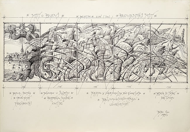 Slika Slobodana-Boba Slovinića, nazvana “Budvanski mit” iz 2000. godine, prikazuje kompleksnu kompoziciju koja je izvedena sa velikom preciznošću i pažnjom prema detaljima, karakterističnim za Slovinićev opus. Slovinić se poigrava perspektivom i prostorom, istovremeno razbijajući i spajajući formu, što gledaocu omogućava da doživi višedimenzionalnost scene. Na slici se prepoznaje tehnička vještina crteža tušem, pri čemu umjetnik demonstrira izuzetnu kontrolu nad linijama i nijansama. Slika je podijeljena na segmente, svaki sa različitim oblicima i motivima, koji zajedno stvaraju mozaik različitih scena ili vizija. Možda su ovi segmenti metafora za različite aspekte mita ili istorije Budve, sugerišući način na koji se istorija sastoji od različitih priča i perspektiva koje su isprepletene. Uprkos tome što je izvedba crno-bijela, djelu ne nedostaje dinamike. Raznovrsnost tekstura i intenzitet linija stvaraju vizualni ritam koji privlači i zadržava pažnju posmatrača. Slovinićeva upotreba simbola i pisma na periferiji djela mogla bi ukazivati na konceptualnu komponentu, dodajući slojeve značenja koja pozivaju na daljnje istraživanje i interpretaciju. Slovinićeva umjetnost izaziva gledaoca da izučava, dešifruje i tumači, ostavljajući mnogo prostora za ličnu interpretaciju. “Budvanski mit” nije samo vizuelni doživljaj; to je intelektualna zagonetka koja se može rješavati i razumjeti na mnogo različitih načina, u skladu sa umjetnikovim poznatim sklonostima ka složenosti i dubini.