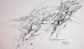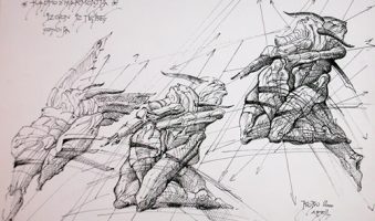 Ciklus “Mit o Budvi” Slobodana-Boba Slovinića jeste duboko uronjen u slojevitu priču, mitologiju i istoriju grada Budve, pretvarajući povijesne narative u vizuelno bogate i složene kompozicije. Slovinić koristi segmentiranje, geometrizaciju i dinamične linije kako bi prenio intenzitet i raznovrsnost mitoloških tema. Njegova djela, sa sveprisutnom upotrebom pera i tuša, odišu tehničkom preciznošću i kontrolom, dok u isto vrijeme provokativno manipulišu prostorom, formom i perspektivom. Upoređujući Slovinićev ciklus sa radovima nekog velikog umetnika, možemo se osvrnuti na ciklus “Crna slika” Fransiska Goje. Iako potiču iz različitih vremenskih perioda i kulturnih konteksta, oba ciklusa istražuju tamnije strane ljudske prirode i mitologije. Goja, kao Slovinić, koristi moćnu simboliku i intenzivnu emotivnost kako bi istražio unutrašnje i spoljašnje sukobe. U “Crnoj slici”, Goja se takođe služi fragmentacijom i deformacijom figure, slično Sloviniću, koristeći dramatične kontraste svijetla i tame koji služe da istaknu emocionalnu težinu teme. Dok Goja u svojim djelima često prikazuje direktnu, gotovo surovu sliku ljudske psihe, Slovinić koristi mitologiju i simbolizam da bi stvorio višeslojne narative koji potiču na razmišljanje. Slovinićeva djela su manje direktna u svojoj emotivnoj ekspresiji, ali su jednako provokativna, pozivajući gledaoce da razlože slojeve značenja i simbolike.