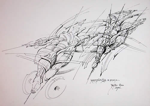 Na crtežu “Harmonija” iz 2000. godine, Slobodan-Bobo Slovinić koristi pero i tuš da bi stvorio djelo koje odiše fluidnošću i usklađenošću. Kompozicija je dinamična, sa likovima koji djeluju kao da lebde ili se kreću kroz prostor, njihove poze i linije kretanja stvaraju dojam balansa i gracioznosti. Kontrast između oštrih linija koje definišu oblike i mekših kontura koje sugerišu pokret, uspješno postiže osjećaj harmonije. Umjetnik je sposoban da koristi ritmičnost linija kako bi doveo do vizuelnog ekvivalenta muzičke harmonije – đe svaki element na slici ima svoje mjesto i doprinosi ukupnom utisku. Figura je razlomljena, a njeni dijelovi se preklapaju i produžuju izvan okvira tijela, što može simbolizovati unutrašnju snagu i energiju. Slovinićeva upotreba prostora i perspektive izaziva gledaoca da traži fokus unutar složene scene. Možda se upravo kroz ovakvu organizaciju scene ukazuje na koncept harmonije – u smislu kohezije i reda unutar prividnog haosa. “Harmonija” može biti interpretirana kao vizuelna metafora za ljudsku sposobnost da nađe ravnotežu i red u mnoštvu iskustava i utisaka. Slovinić ovdje demonstrira ne samo svoju tehničku vještina u radu sa perom i tušem, već i sposobnost da prenese složene koncepte kroz jasne, izražajne vizuelne forme.