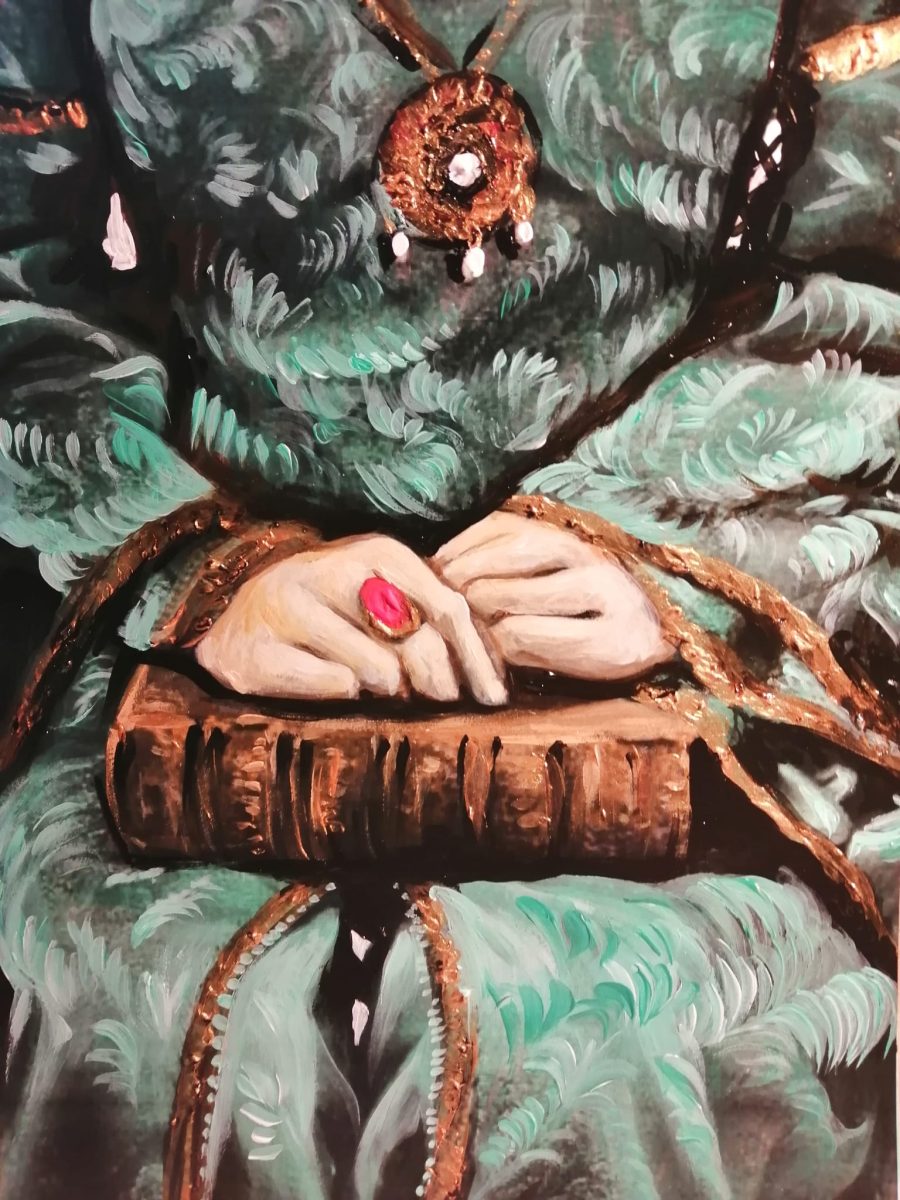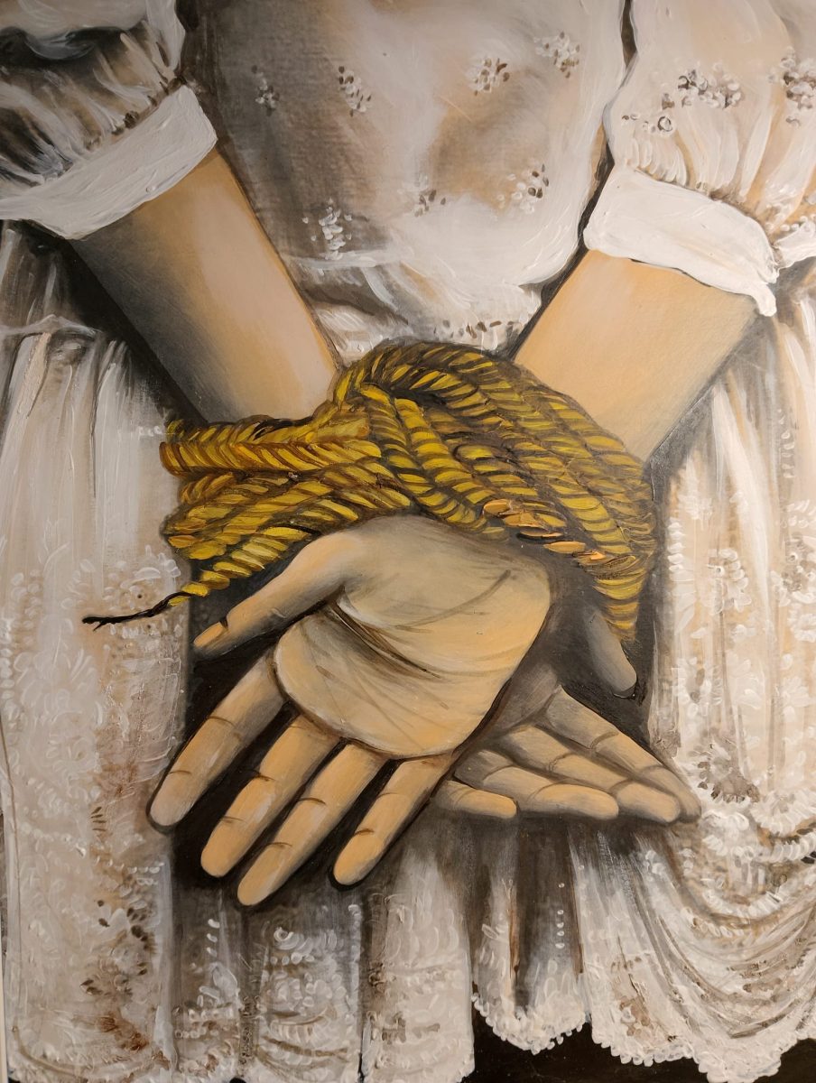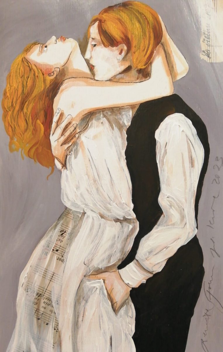 Često slikarica gradi kompozicije s delikatnim, odmjerenim motivima koji izviru iz trenutka, susreta, pogleda, dodira, osjećaja.