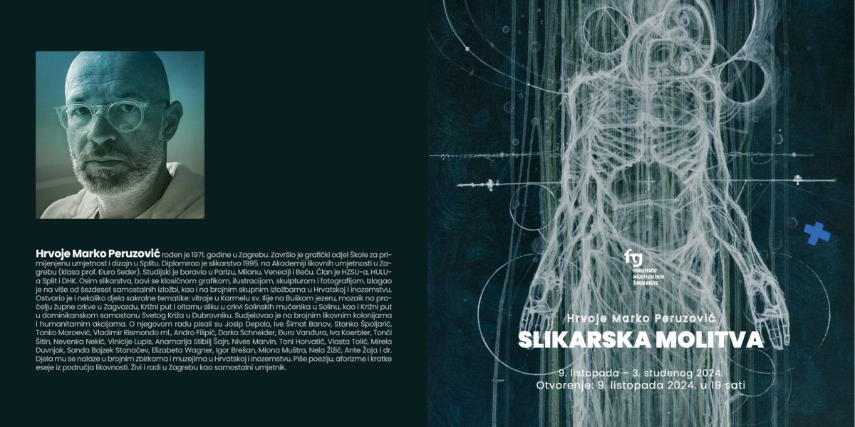 Svečano otvorenje izložbe “Slikarska molitva” Hrvoja Marka Peruzovića je 9. listopada 2024. u 19 sati. Izložba ostaje otvorena do 3. studenog 2024.
