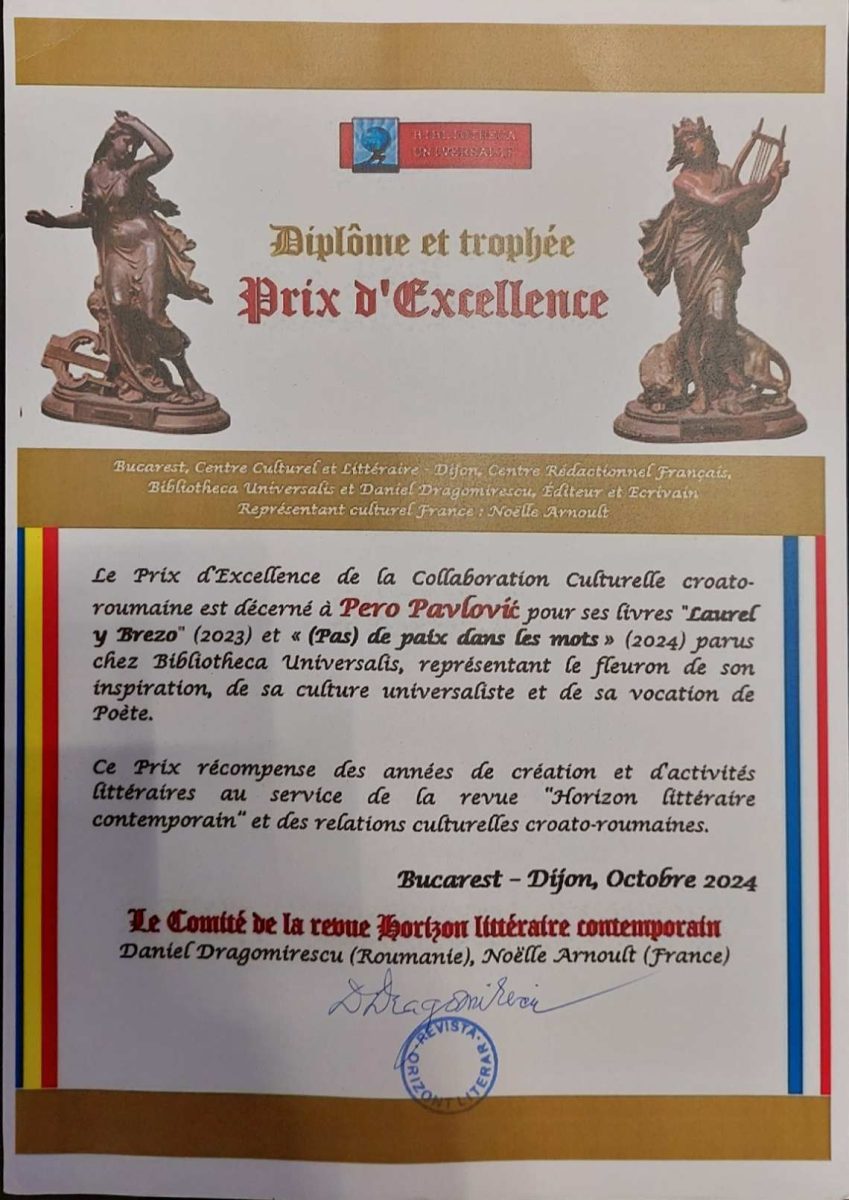 Posebno se to odnosi na knjige poezije ”Lovor i vrijes” na španjolskom i rumunjskom jeziku i ”(Ne)mir u riječima” na engleskom i francuskom jeziku koje su objavljene u Bukureštu. Izdavač je Bibliotheca Universalis. U obrazloženju nagrade spominje se da objavljene pjesme predstavljaju perjanice inspiracije, njegove univerzalističke kulture i njegovog pjesničkog poziva. Navodi se i autorov doprinos unapređenju hrvatsko-rumunjskih kulturnih odnosa. Ovom nagradom nagrađuje se i višegodišnje stvaralaštvo i književno djelovanje u službi časopisa ”Horizon litteraire contemporain” u kojemu objavljuju književnici iz cijeloga svijeta na više stranih jezika. U ime uredništva časopisa nagradu dodjeljuju književnik i glavni urednik Daniel Dragomirescu i francuska predstavnica, književnica i prevoditeljica Noelle Arnoult iz Dijona u Francuskoj. (P.P.)