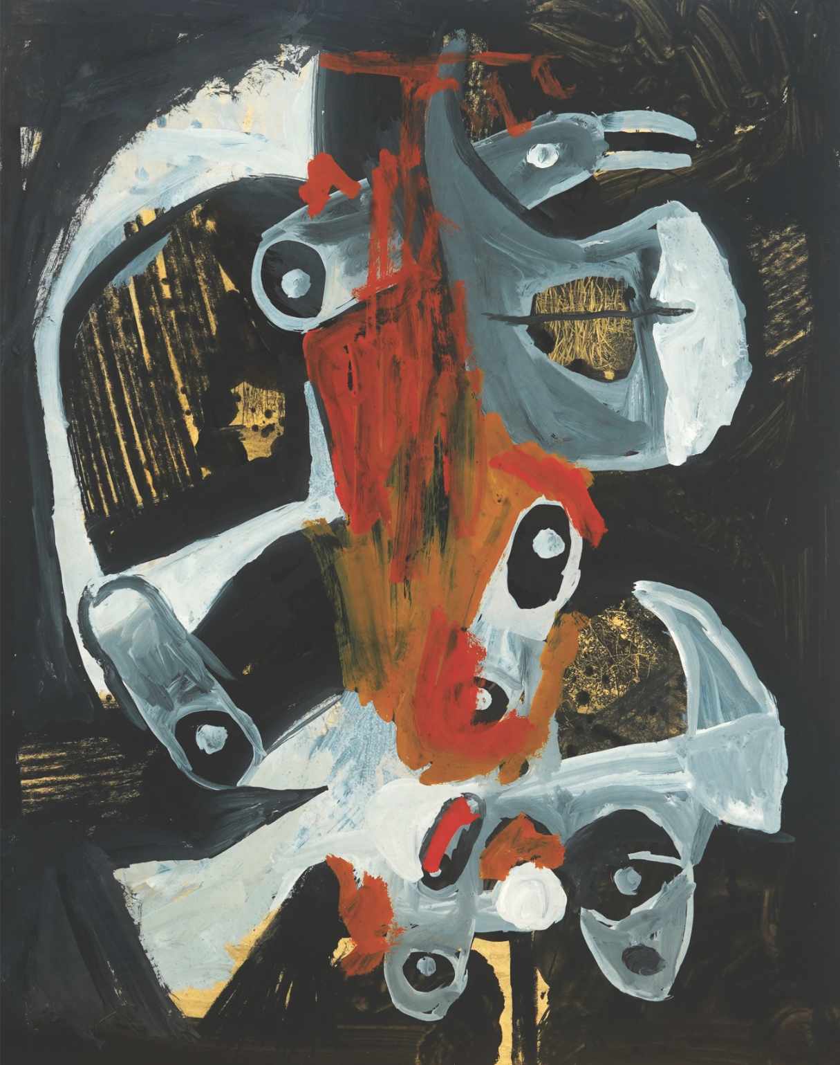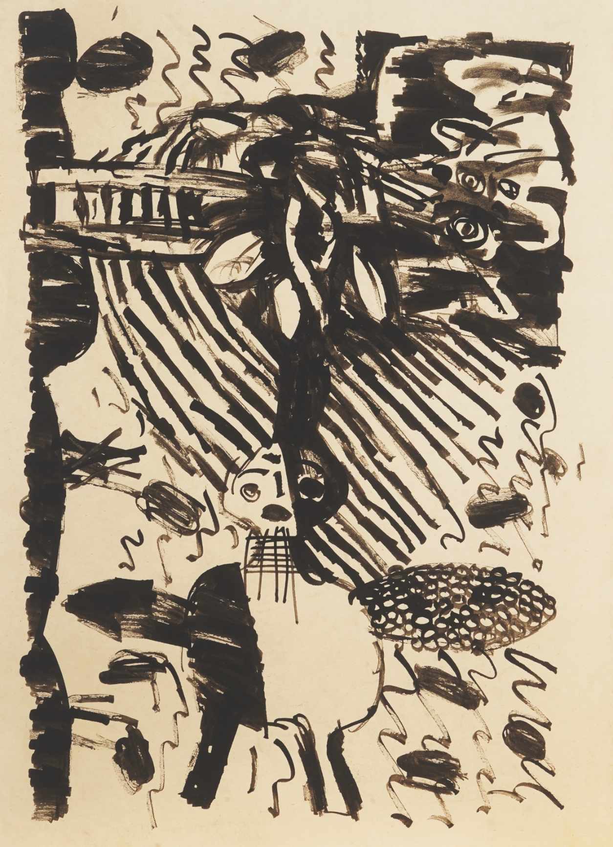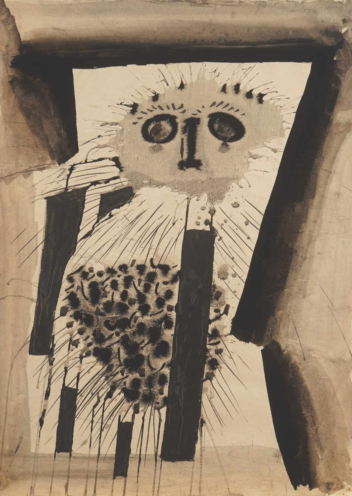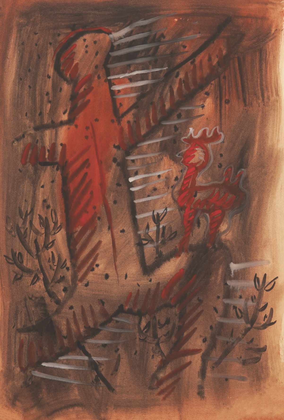 Referentni okvir u koji se postavljaju radovi s ove izložbe pronalazi se u estetici art bruta , koja figuraciju tumači po principu prepoznavanja određenih simbola s jasnim arhetipskim značenjima. Oblici koji pritom nastaju začudni su rezultat dječje zaigranosti umjetnika. Neki su od njih neobični spojevi ljudi i životinja proizašli iz fantazmagoričnog bestijarija kojim su napučeni portali srednjovjekovnih katedrala. Svakako treba istaknuti jedno djelo iz ciklusa iz obiteljskog dvorišta. Riječ je o skici za djelo Pijetao-ruka koje je Šutej izveo u temperi i akvarelu, 1958. godine, dok je skica na biblijskom papiru vrlo detaljno izrađena rapidografom.