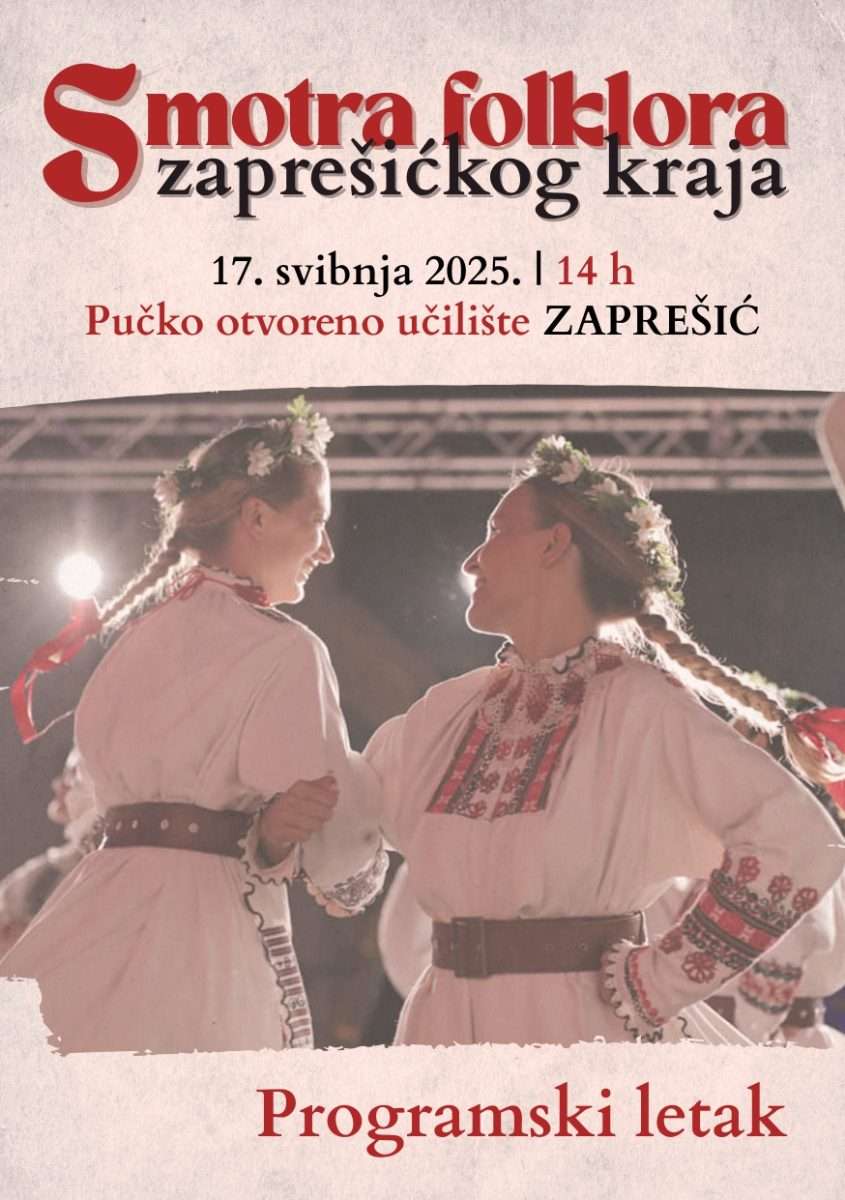 Zajednica u kulturi grada Zaprešića po prvi put s ponosom organizira Smotru folklora zaprešićkog kraja, koja će se održati u subotu, 17. svibnja 2025. godine s početkom u 14 sati u Pučkom otvorenom učilištu Zaprešić