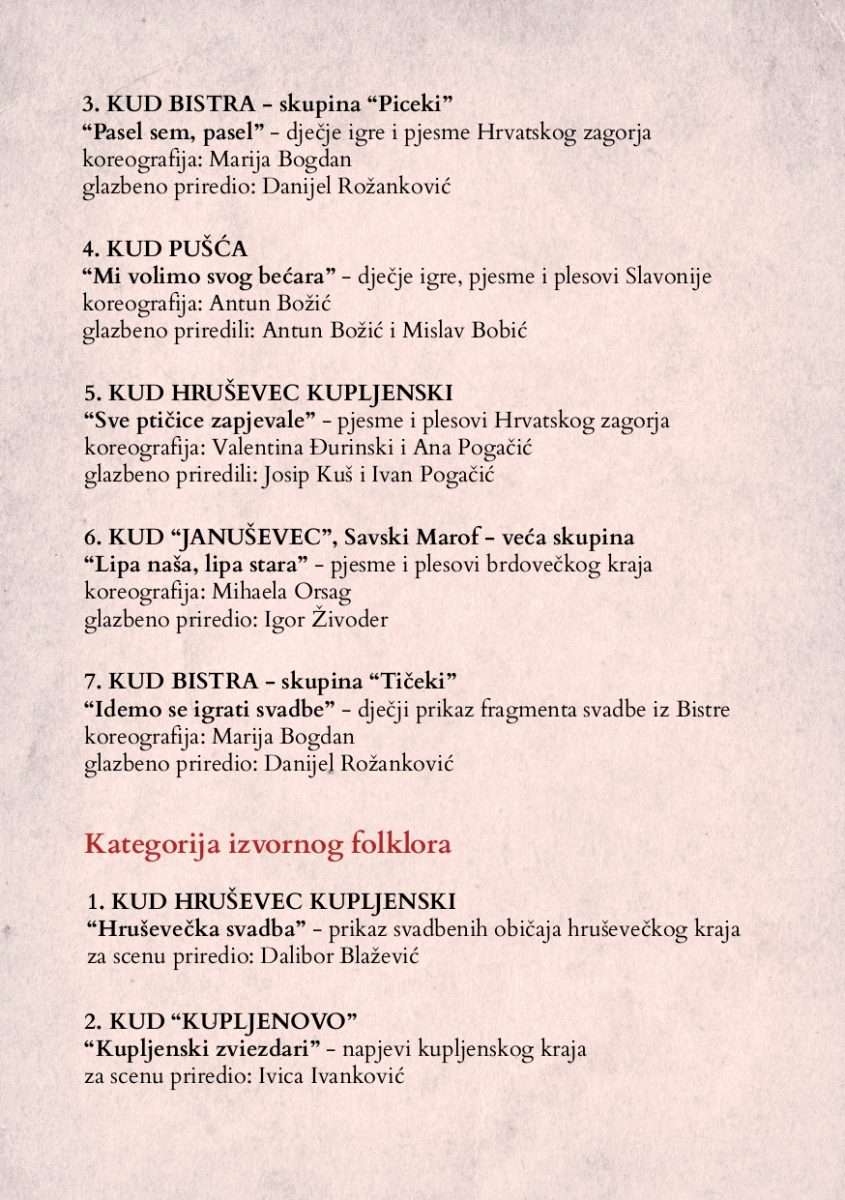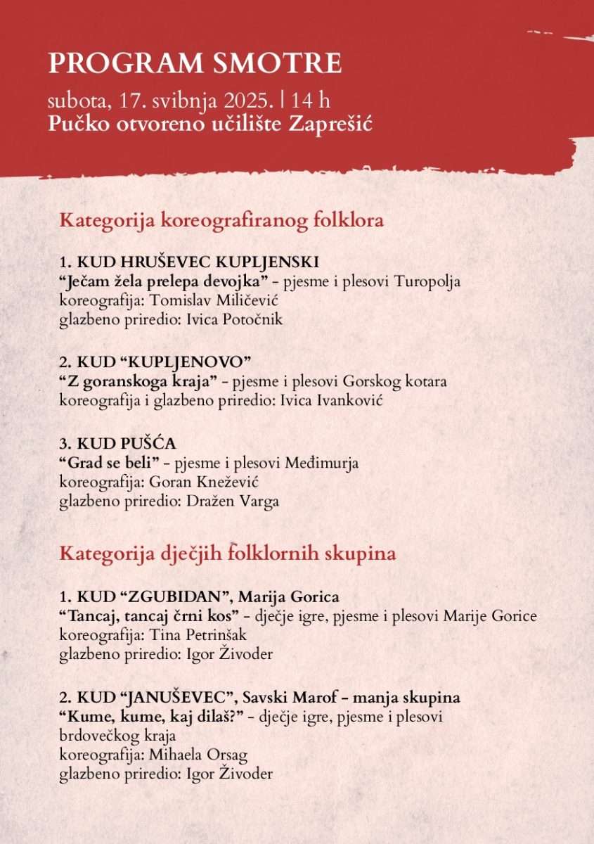 Program obuhvaća tri kategorije: dječje folklorne skupine, koreografirani folklor i izvorni folklor, a svi sudionici prezentirat će svoju jedinstvenu interpretaciju narodnog stvaralaštva. Cilj ove manifestacije je njegovanje i očuvanje bogate tradicijske kulture zaprešićkog kraja, kao i poticanje međugeneracijskog povezivanja kroz zajednički izričaj folklora. Program će pratiti stručno povjerenstvo u sastavu: Goran Ivan Matoš, Petar Varga i Tina Miličević, koje će odabrati najbolja društva za sudjelovanje na daljnjim smotrama na regionalnoj i državnoj razini.