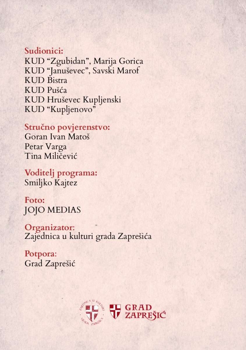 Na ovoj svečanoj manifestaciji zaprešićka publika imat će priliku uživati u raznolikosti i bogatstvu narodnih običaja, glazbe i plesova, kroz nastupe šest kulturno-umjetničkih društava zaprešićkog kraja: