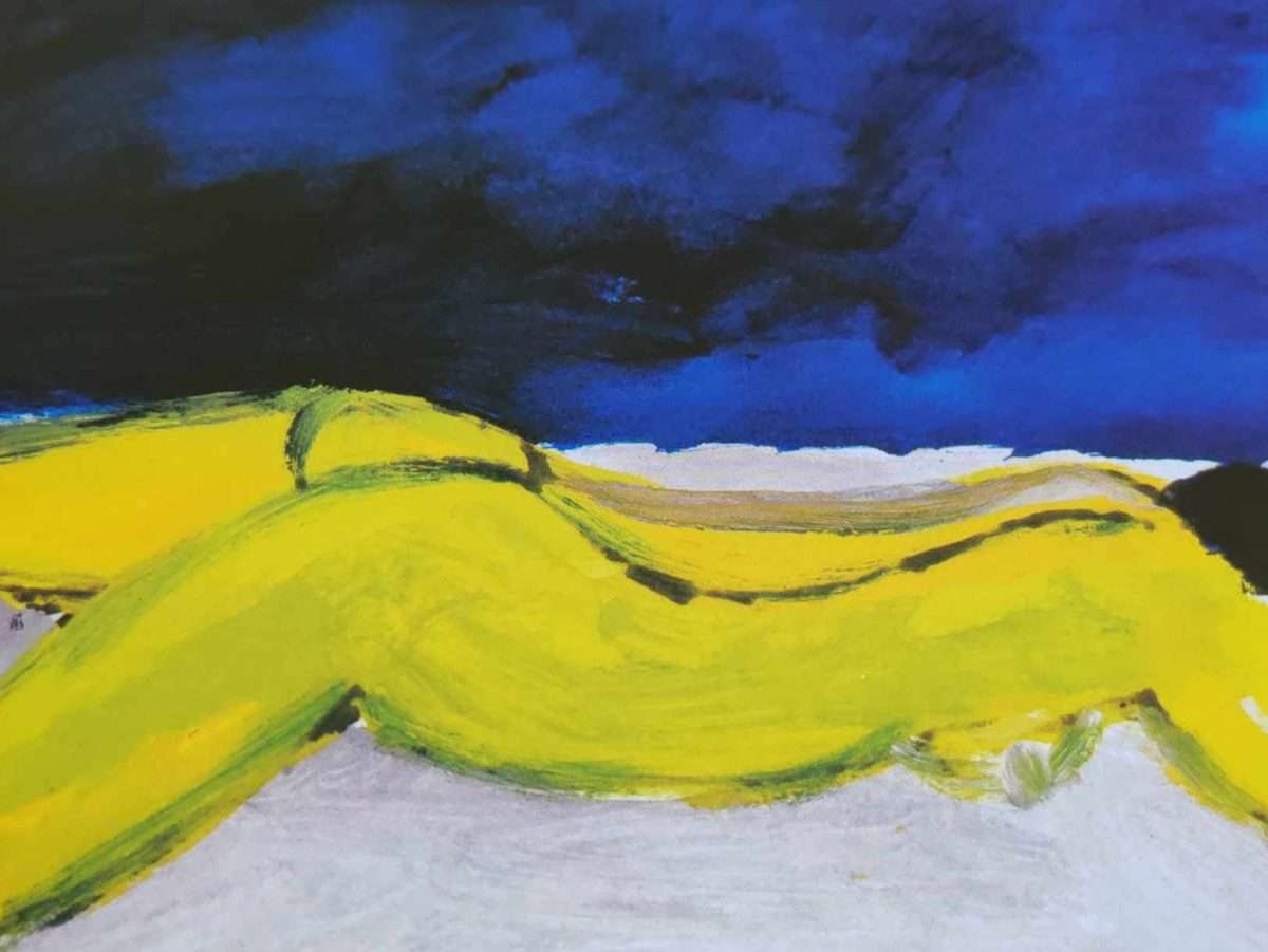 Sanjarski aktovi, umireni, tihi, u osluškivanju zvuka iz daleka, tijela u grču, uznemireno lice, promiču ispred nas u rješenjima dominantne žute boje, ugodne oku, vrlo vidljive.
