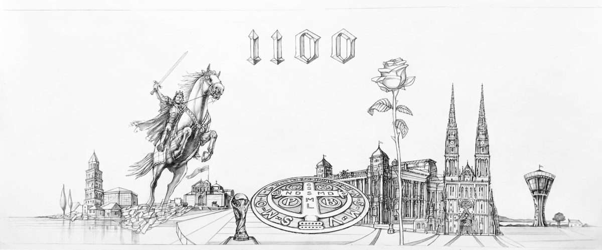 Na crtežu su s lijeva na desno: sveti Duje crkva u Splitu, dokument o kralju Tomislavu, crkva u Hercegovini, sveti Benedikt, HNK kao simbol hrvatske kulture, ruža simbol opstojnosti jednog naroda , slavonski hrast i Vukovarski vodotoranj simbol otpora.