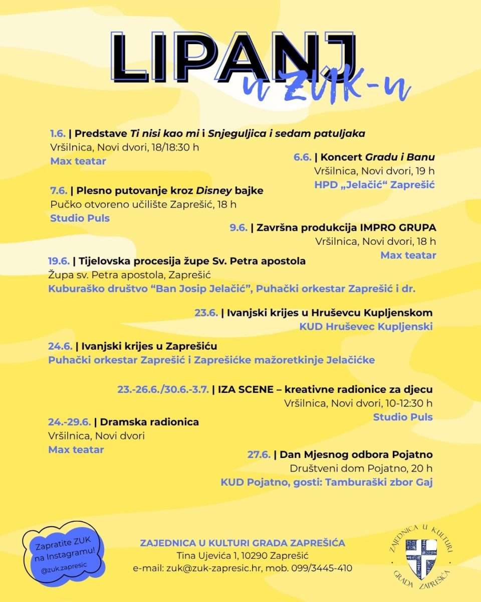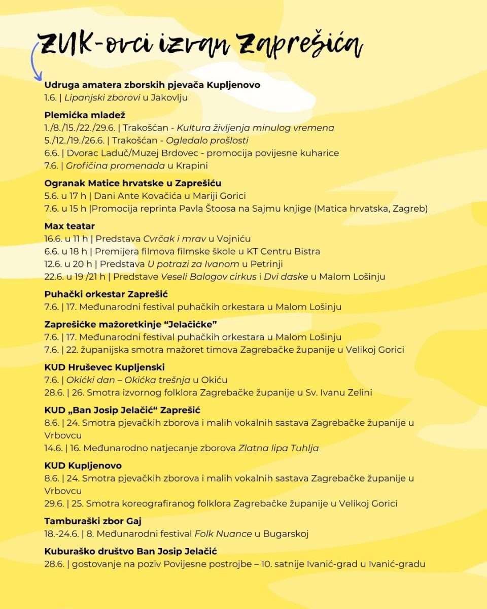 Istodobno, u samome Zaprešiću očekuju nas kazališne predstave, koncerti, kreativne radionice i tradicionalni Ivanjski krijesovi – sve to na pragu ljeta. U nastavku donosimo program događanja u kojima sudjeluju članovi ZUK-a: