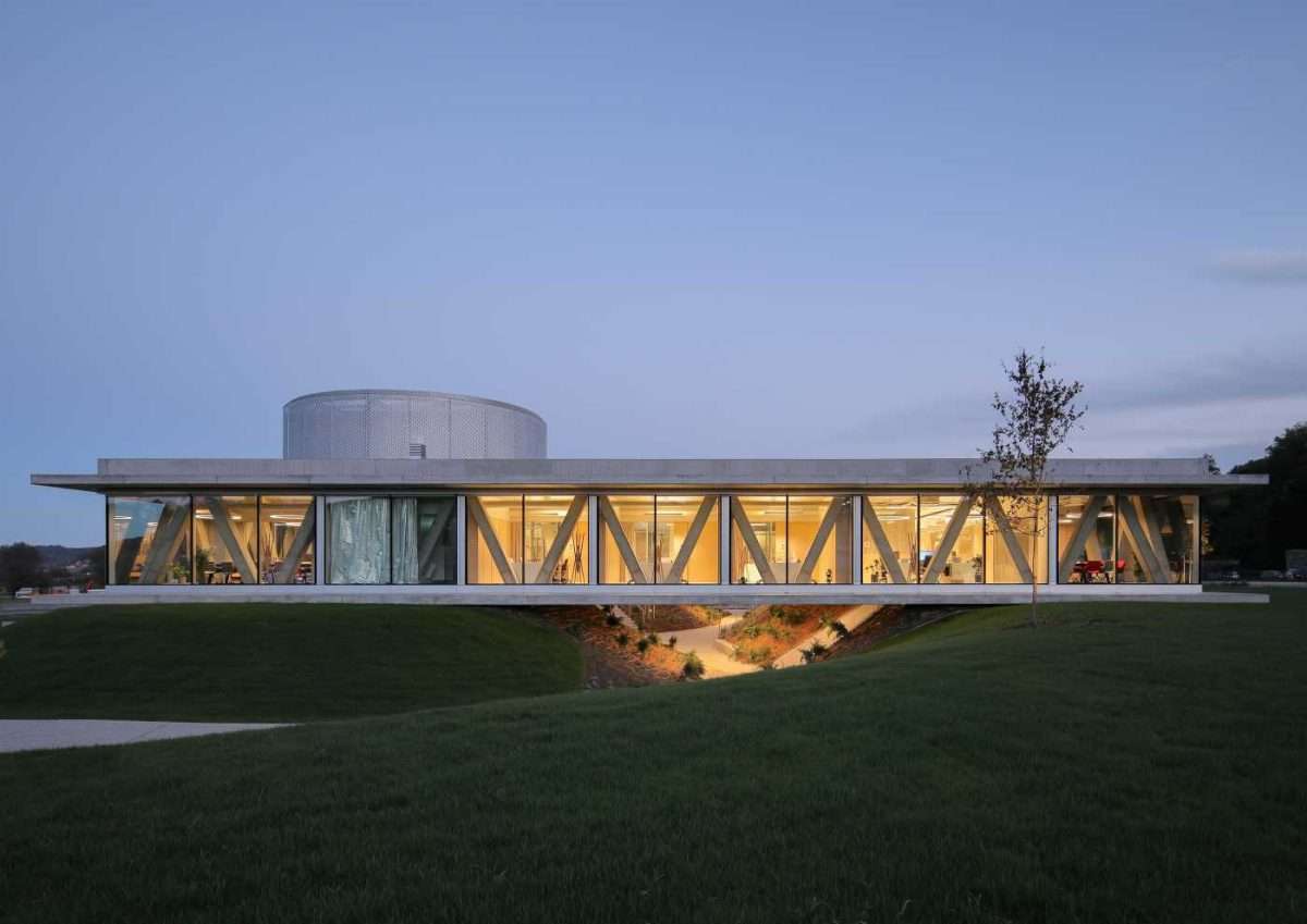 Jednoetažna građevina kvadratičnog tlocrta, izdignuta na topografiji triju humaka, naoko levitira, pozivajući na postupno otkrivanje – ponajprije prolaskom „ispod“, a potom dolaskom u središnji kružni atrij otkuda se parom stubišnih krakova uspinje prema unutrašnjosti objekta.