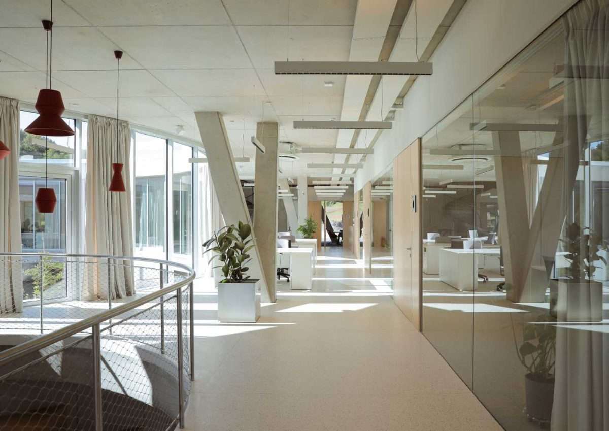 Po ulasku, korisnik se nalazi u „mekom“ unutarnjem perimetru kuće, čija forma omogućuje autonomno nizanje sadržaja te njihovu konzumaciju kružnim, gotovo muzejskim kretanjem kroz prostor. Taj inkluzivan obruč, snažno orijentiran prema atriju, objedinjuje recepciju, slobodno pozicionirana radna mjesta, malu kružnu dvoranu, spiralne stube koje vode do sadržaja na krovnoj etaži te maleni auditorij. Neprimjetno se otvarajući prema suterenskoj etaži, on se postupno prelijeva na zajedničke boravišne prostore i nastavlja prema vanjskoj terasi. Kao kontrapunkt ovoj tečnoj prostornoj dinamici, vanjski, oblikovno „tvrdi“ perimetar objekta karakteriziraju klasičniji, modularno nanizani radni prostori s jasnim fokusom na okolni pejzaž.